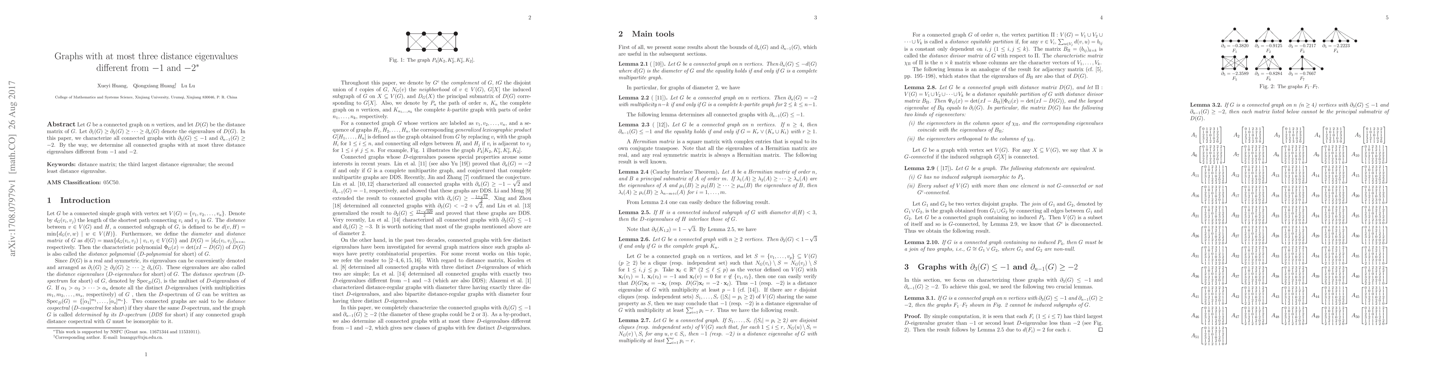 This paper characterizes connected graphs where the third largest distance eigenvalue is at most $-1$ and the $(n-1)$-th largest eigenvalue is at least $-2$. It also identifies all connected graphs with no more than three distance eigenvalues differing from $-1$ and $-2$.