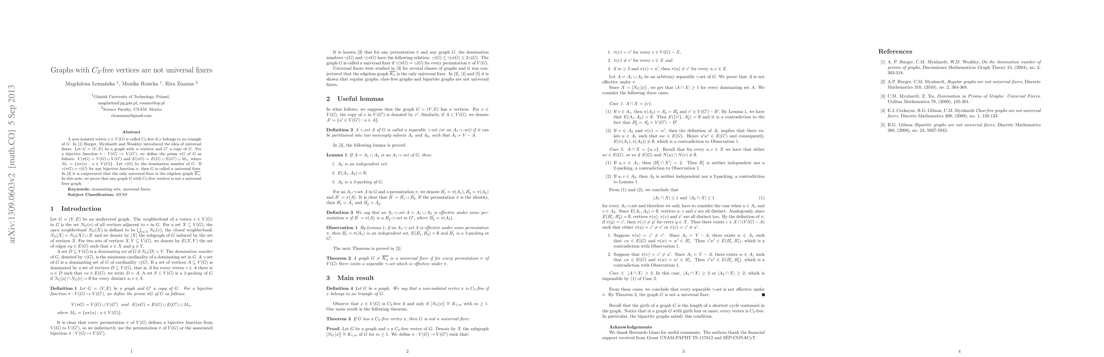 A non-isolated vertex $x\in V(G)$ is called $C_{3}$-free if $x$ belongs to no triangle of $G$. In \cite{BMW} Burger, Mynhardt and Weakley introduced the idea of universal fixers. Let $G=(V,E)$ be a graph with $n$ vertices and $G'$ a copy of $G$. For a bijective function $\pi:V(G)\mapsto V (G')$, we define the prism $\pi G$ of $G$ as follows: $V(\pi G)=V(G)\cup V(G')$ and $E(\pi G)=E(G)\cup E(G')\cup M_{\pi}$, where $M_{\pi}=\{u\pi (u): u\in V(G)\}$. Let $\gamma(G)$ be the domination number of $G$. If $\gamma(\pi G)=\gamma(G)$ for any bijective function $\pi$, then $G$ is called a universal fixer. In \cite{MX} it is conjectured that the only universal fixer is the edgeless graph $\bar{K_n}$. In this note, we prove that any graph $G$ with $C_3$-free vertices is not a universal fixer graph.