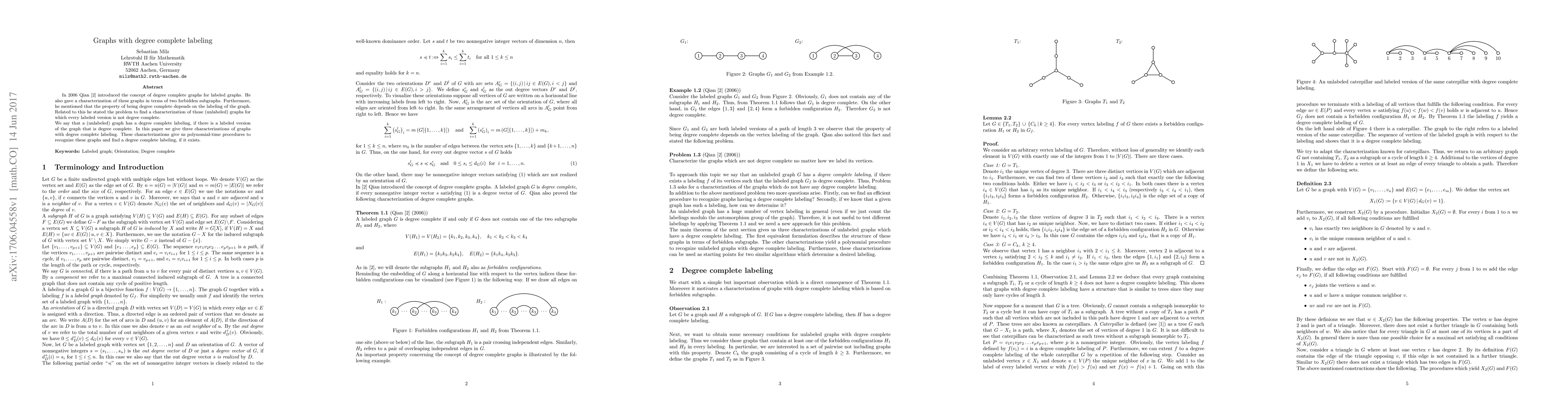 In 2006 Qian [J. Qian, Degree complete graphs; Discrete Mathematics 306 (2006), 533--537] introduced the concept of degree complete graphs for labeled graphs. He also gave a characterization of these graphs in terms of two forbidden subgraphs. Furthermore, he mentioned that the property of being degree complete depends on the labeling of the graph. Related to this he stated the problem to find a characterization of those (unlabeled) graphs for which every labeled version is not degree complete. We say that a (unlabeled) graph has a degree complete labeling, if there is a labeled version of the graph that is degree complete. In this paper we give three characterizations of graphs with degree complete labeling. These characterizations give us polynomial-time procedures to recognize these graphs and find a degree complete labeling, if it exists.