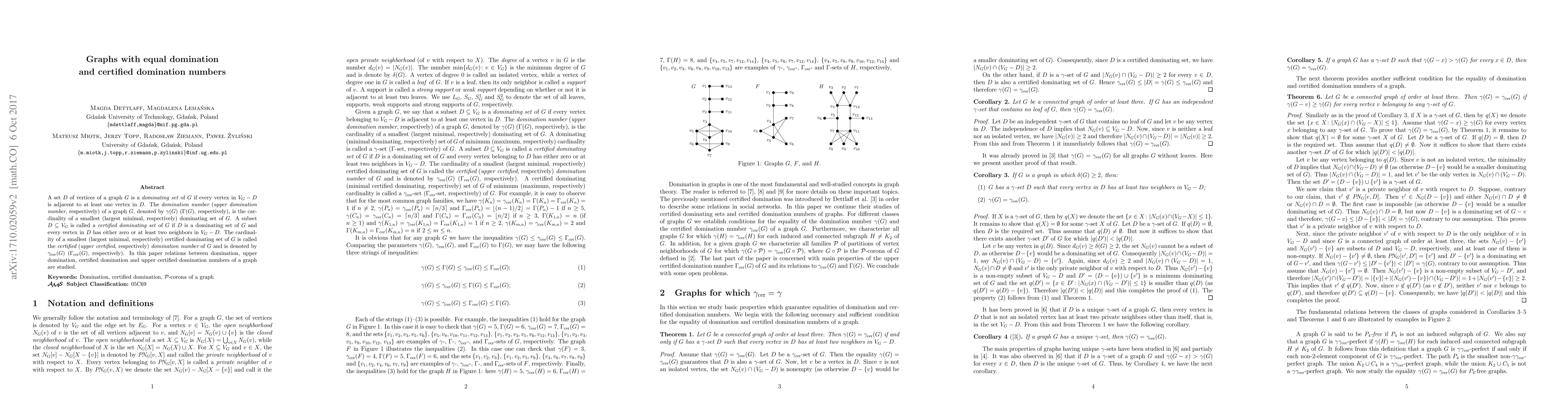 A set $D$ of vertices of a graph $G$ is a dominating set of $G$ if every vertex in $V_G-D$ is adjacent to at least one vertex in $D$. The domination number (upper domination number, respectively) of a graph $G$, denoted by $\gamma(G)$ ($\Gamma(G)$, respectively), is the cardinality of a smallest (largest minimal, respectively) dominating set of $G$. A subset $D\subseteq V_G$ is called a certified dominating set of $G$ if $D$ is a dominating set of $G$ and every vertex in $D$ has either zero or at least two neighbors in $V_G-D$. The cardinality of a~smallest (largest minimal, respectively) certified dominating set of $G$ is called the certified upper certified, respectively domination number of $G$ and is denoted by $\gamma_{\rm cer}(G)$ ($\Gamma_{\rm cer}(G)$, respectively). In this paper relations between domination, upper domination, certified domination and upper certified domination numbers of a graph are studied.