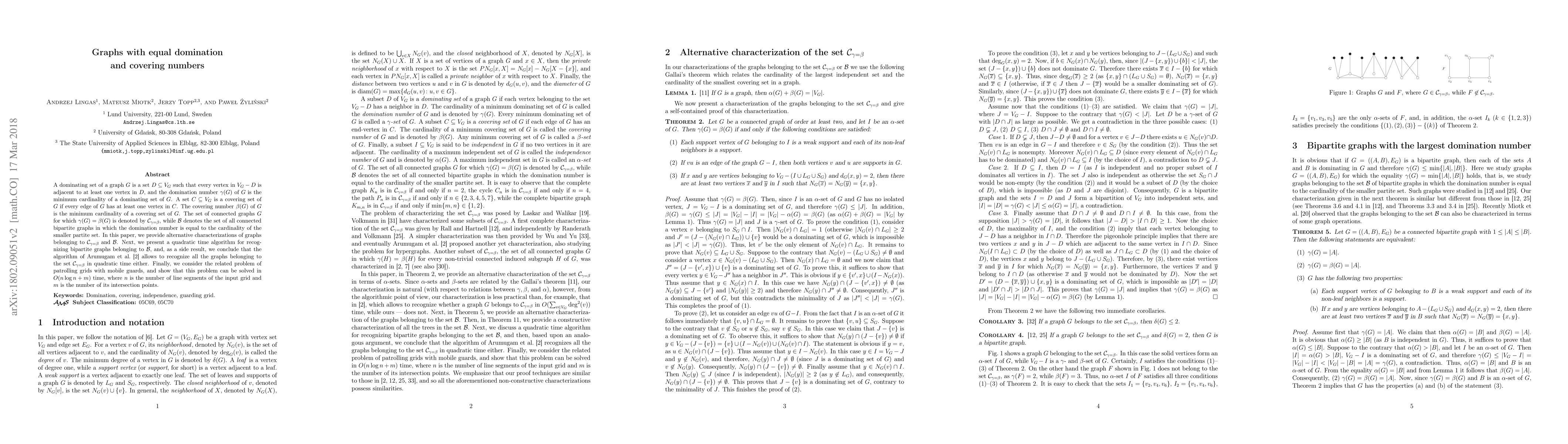 A dominating set of a graph $G$ is a set $D\subseteq V_G$ such that every vertex in $V_G-D$ is adjacent to at least one vertex in $D$, and the domination number $\gamma(G)$ of $G$ is the minimum cardinality of a dominating set of $G$. A set $C\subseteq V_G$ is a covering set of $G$ if every edge of $G$ has at least one vertex in $C$. The covering number $\beta(G)$ of $G$ is the minimum cardinality of a covering set of $G$. The set of connected graphs $G$ for which $\gamma(G)=\beta(G)$ is denoted by ${\cal C}_{\gamma=\beta}$, while ${\cal B}$ denotes the set of all connected bipartite graphs in which the domination number is equal to the cardinality of the smaller partite set. In this paper, we provide alternative characterizations of graphs belonging to ${\cal C}_{\gamma=\beta}$ and ${\cal B}$. Next, we present a quadratic time algorithm for recognizing bipartite graphs belonging to ${\cal B}$, and, as a side result, we conclude that the algorithm of Arumugam et al. [2] allows to recognize all the graphs belonging to the set ${\cal C}_{\gamma=\beta}$ in quadratic time either. Finally, we consider the related problem of patrolling grids with mobile guards, and show that this problem can be solved in $O(n \log n + m)$ time, where $n$ is the number of line segments of the input grid and $m$ is the number of its intersection points.