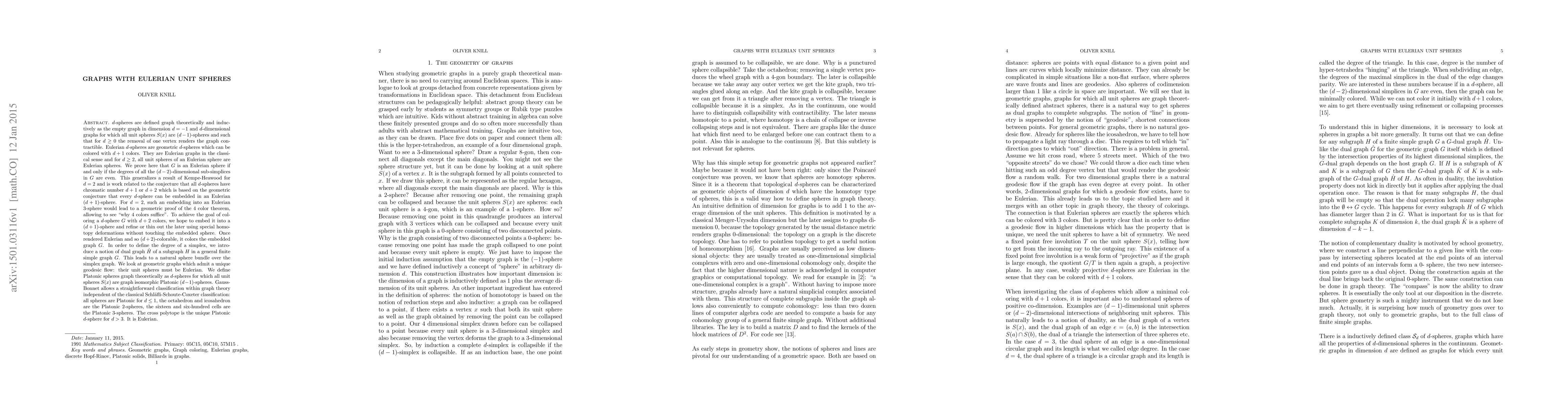 d-spheres in graph theory are inductively defined as graphs for which all unit spheres S(x) are (d-1)-spheres and that the removal of one vertex renders the graph contractible. Eulerian d-spheres are geometric d-spheres which are d+1 colorable. We prove here that G is an Eulerian sphere if and only if the degrees of all the (d-2)-dimensional sub-simplices in G are even. This generalizes a Kempe-Heawood result for d=2 and is work related to the conjecture that all d-spheres have chromatic number d+1 or d+2 which is based on the geometric conjecture that every d-sphere can be embedded in an Eulerian (d+1)-sphere. For d=2, such an embedding into an Eulerian 3-sphere would lead to a geometric proof of the 4 color theorem, allowing to see "why 4 colors suffice". To achieve the goal of coloring a d-sphere G with d+2 colors, we hope to embed it into a (d+1)-sphere and refine or thin out the later using special homotopy deformations without touching the embedded sphere. Once rendered Eulerian and so (d+2)-colorable, it colors the embedded graph G. In order to define the degree of a simplex, we introduce a notion of dual graph H' of a subgraph H in a general finite simple graph G. This leads to a natural sphere bundle over the simplex graph. We look at geometric graphs which admit a unique geodesic flow: their unit spheres must be Eulerian. We define Platonic spheres graph theoretically as d-spheres for which all unit spheres S(x) are graph isomorphic Platonic (d-1)-spheres. Gauss-Bonnet allows a classification within graph theory: all spheres are Platonic for d=1, the octahedron and icosahedron are the Platonic 2-spheres, the sixteen and six-hundred cells are the Platonic 3-spheres. The cross polytop is the unique Platonic d-sphere for d>3. It is Eulerian.
