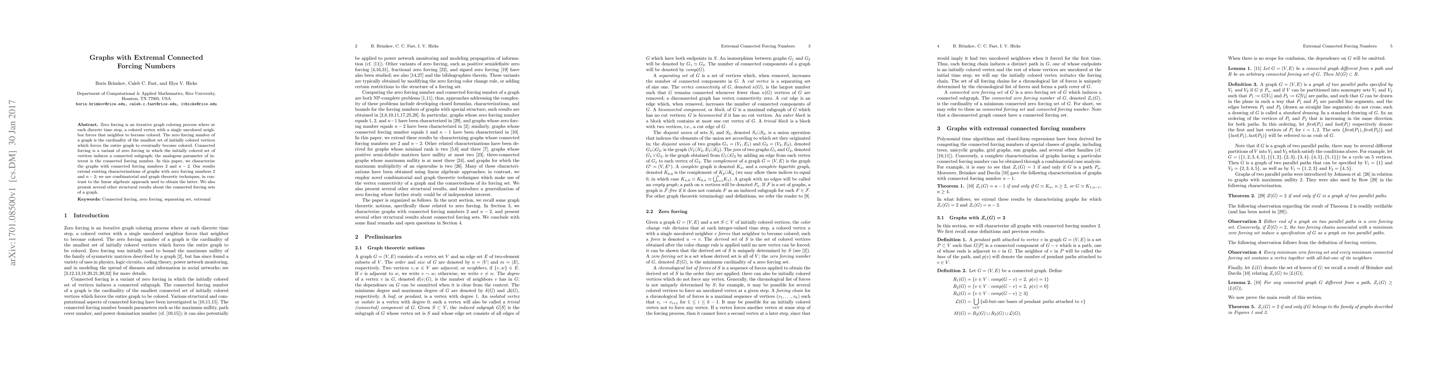 This paper characterizes graphs with connected forcing numbers 2 and $n-2$, extending previous results on zero forcing numbers using combinatorial and graph-theoretic techniques. It also provides additional structural insights into connected forcing sets.