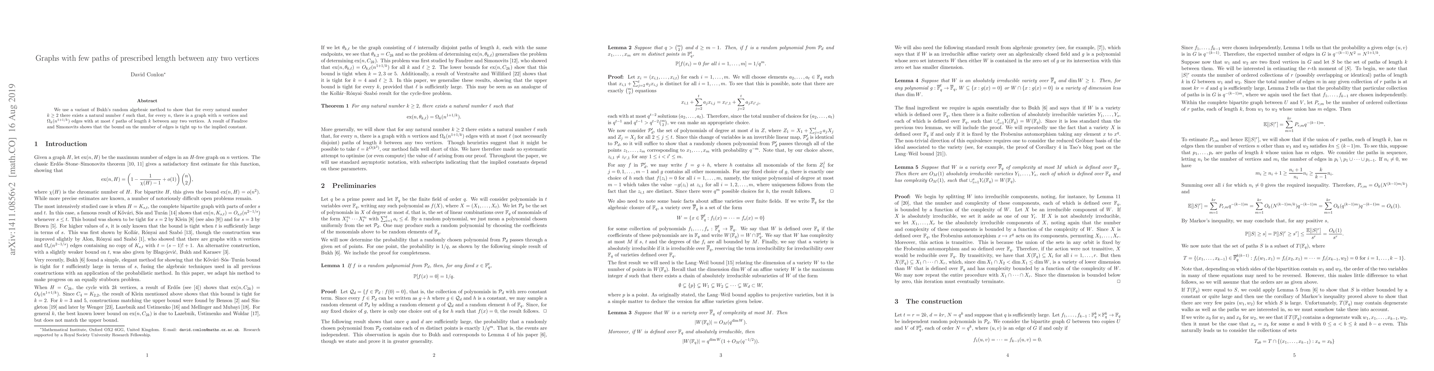 This paper demonstrates the existence of sparse graphs with a specific number of edges that have few $k$-length paths between any two vertices, using a modified random algebraic method. The result shows that the edge count is asymptotically tight.