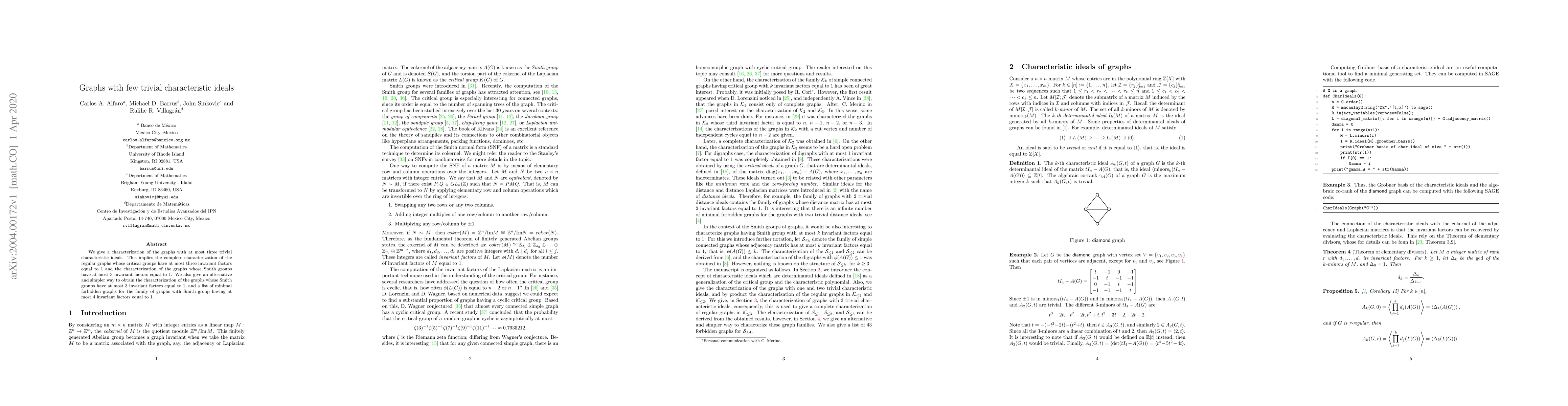 We give a characterization of the graphs with at most three trivial characteristic ideals. This implies the complete characterization of the regular graphs whose critical groups have at most three invariant factors equal to 1 and the characterization of the graphs whose Smith groups have at most 3 invariant factors equal to 1. We also give an alternative and simpler way to obtain the characterization of the graphs whose Smith groups have at most 3 invariant factors equal to 1, and a list of minimal forbidden graphs for the family of graphs with Smith group having at most 4 invariant factors equal to 1.