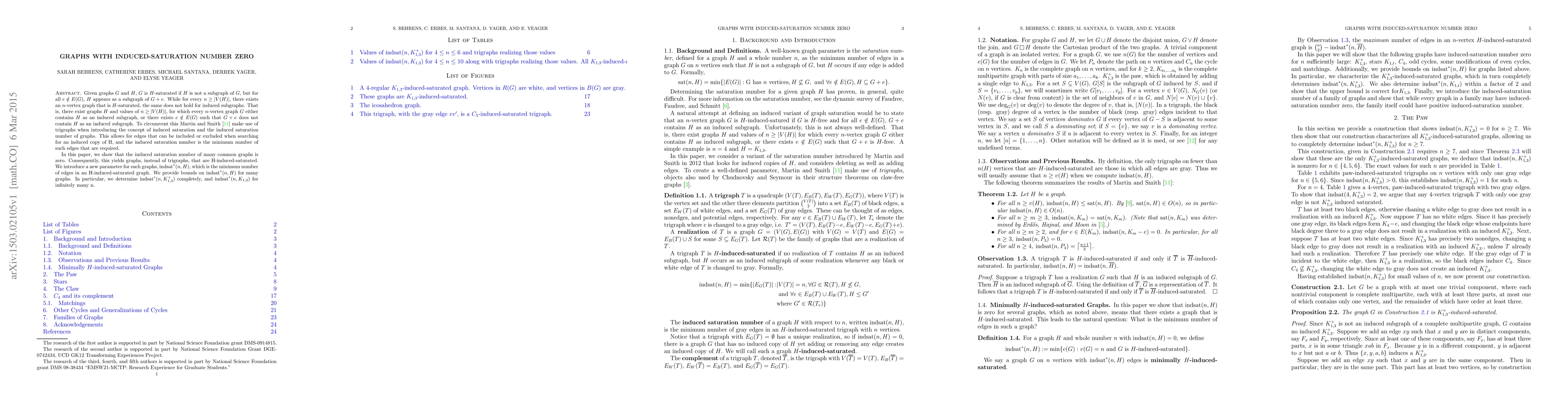 Given graphs $G$ and $H$, $G$ is $H$-saturated if $H$ is not a subgraph of $G$, but for all $e \notin E(G)$, $H$ appears as a subgraph of $G + e$. While for every $n \ge |V(H)|$, there exists an $n$-vertex graph that is $H$-saturated, the same does not hold for induced subgraphs. That is, there exist graphs $H$ and values of $n \ge |V(H)|$ for which every $n$-vertex graph $G$ either contains $H$ as an induced subgraph, or there exists $e \notin E(G)$ such that $G + e$ does not contain $H$ as an induced subgraph. To circumvent this, Martin and Smith make use of trigraphs when introducing the concept of induced saturation and the induced saturation number of graphs. This allows for edges that can be included or excluded when searching for an induced copy of H, and the induced saturation number is the minimum number of such edges that are required. In this paper, we show that the induced saturation number of many common graphs is zero. Consequently, this yields graphs, instead of trigraphs, that are H-induced-saturated. We introduce a new parameter for such graphs, indsat*(n;H), which is the minimum number of edges in an H-induced-saturated graph on n vertices. We provide bounds on indsat*(n;H) for many graphs. In particular, we determine indsat*(n;paw) completely, and indsat*(n;$K_{1,3}$) for infinitely many n.