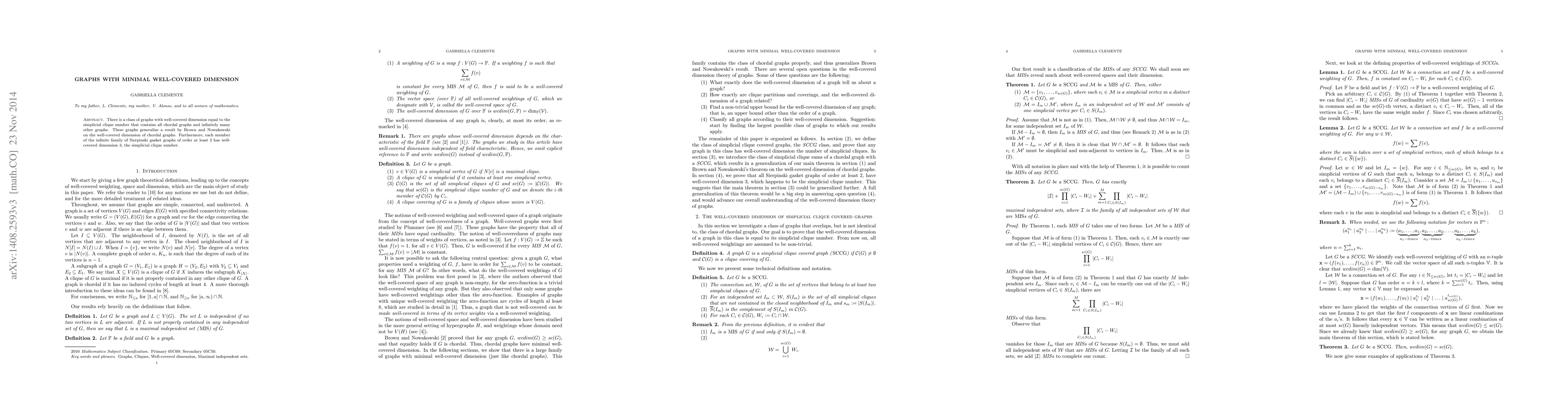 This paper explores graphs with minimal well-covered dimension, demonstrating that chordal graphs and a large class of other graphs have this dimension equal to their simplicial clique number. Additionally, it shows that Sierpinski gasket graphs of order at least $2$ possess a well-covered dimension of $3$.