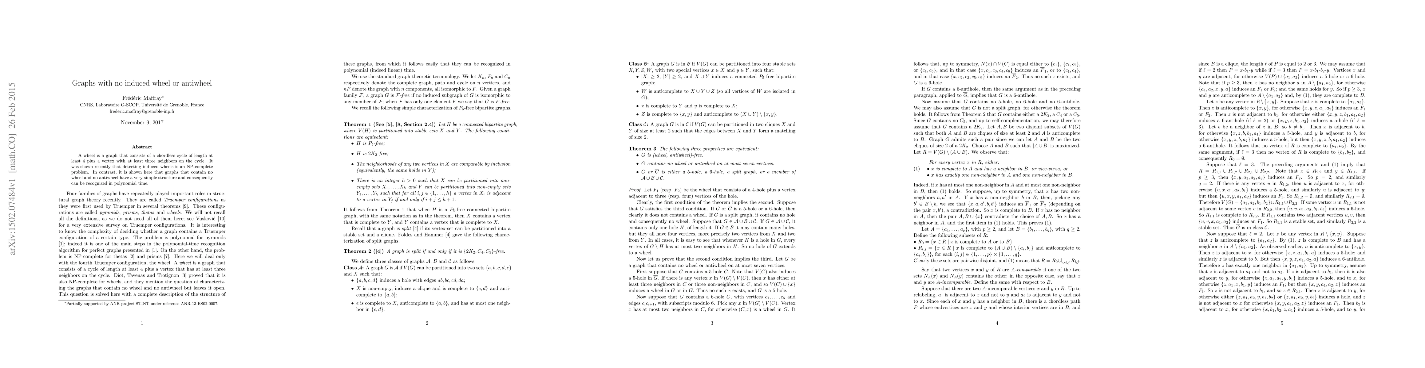 A wheel is a graph that consists of a chordless cycle of length at least 4 plus a vertex with at least three neighbors on the cycle. It was shown recently that detecting induced wheels is an NP-complete problem. In contrast, it is shown here that graphs that contain no wheel and no antiwheel have a very simple structure and consequently can be recognized in polynomial time.