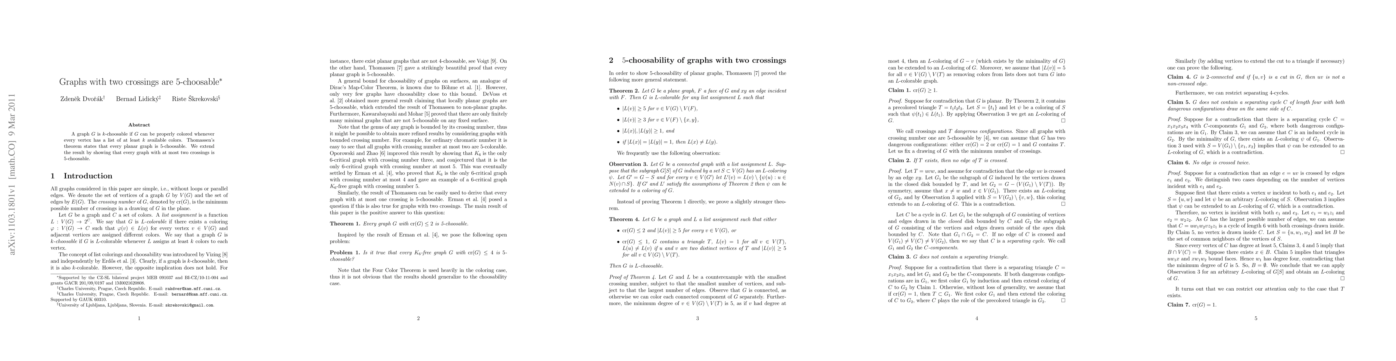 A graph G is k-choosable if G can be properly colored whenever every vertex has a list of at least k available colors. Thomassen's theorem states that every planar graph is 5-choosable. We extend the result by showing that every graph with at most two crossings is 5-choosable.