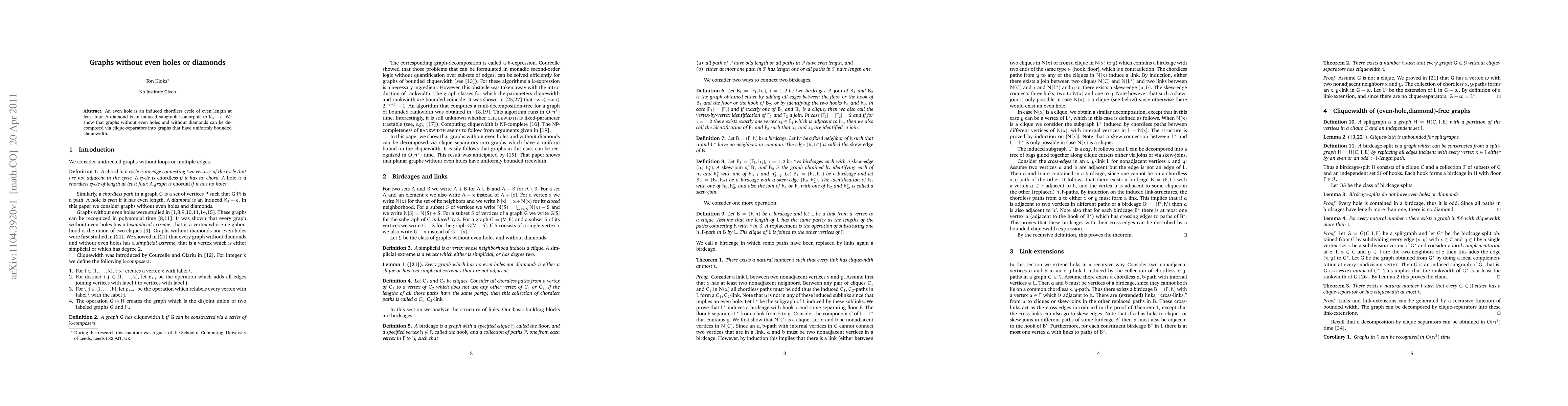 Summary: This paper demonstrates that graphs devoid of even holes and diamonds can be decomposed into components with uniformly bounded cliquewidth through the use of clique-separators, providing a structural decomposition method for such graphs.