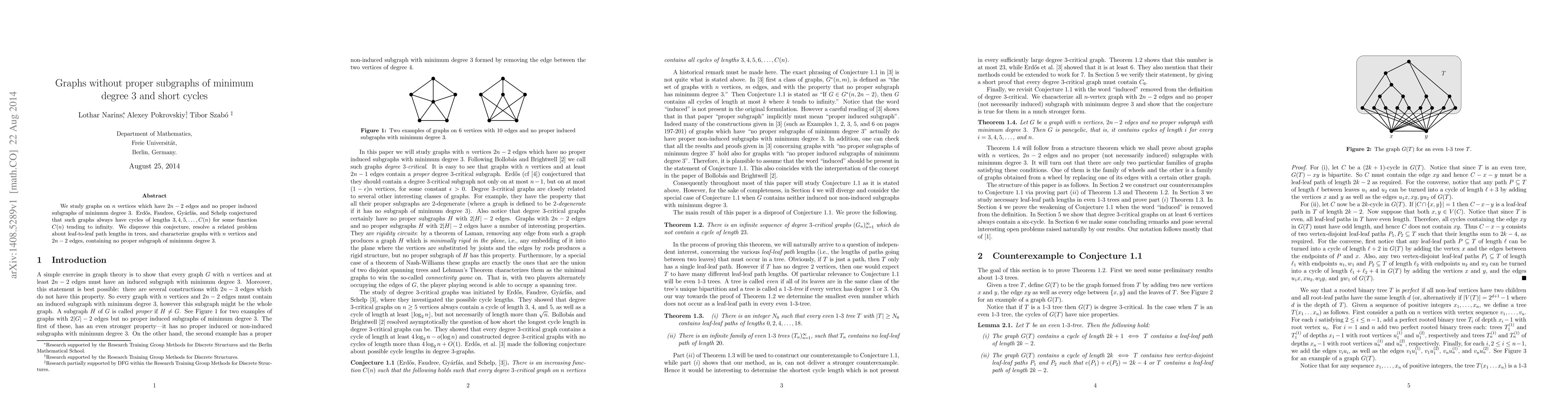 This paper disproves a conjecture about graphs with certain properties, resolving a related problem about leaf-to-leaf path lengths in trees. It characterizes specific types of graphs that have no proper subgraphs of minimum degree 3.