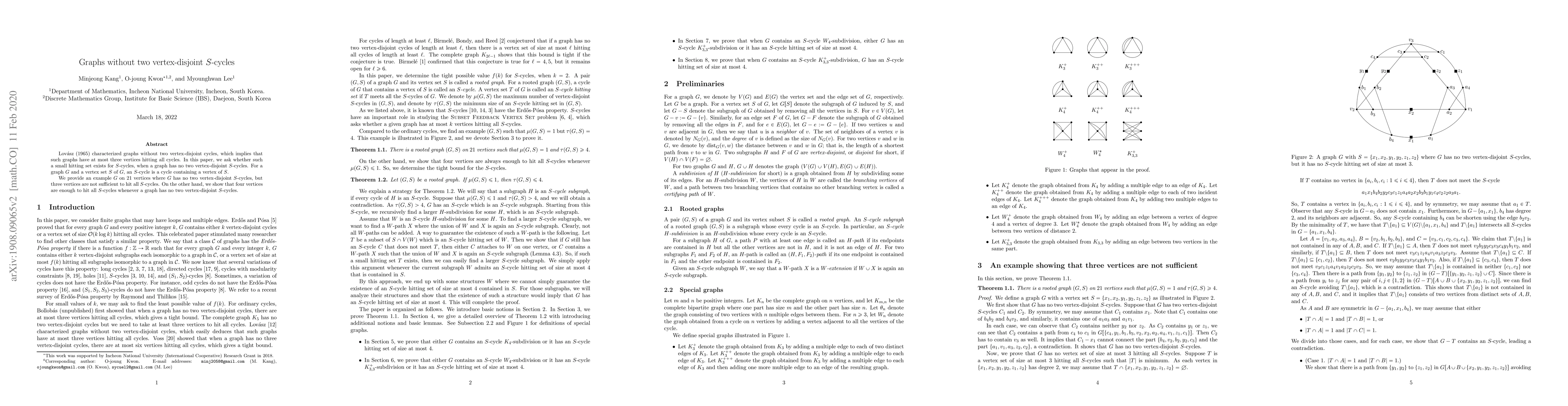 This paper investigates the existence of a small hitting set for $S$-cycles in graphs without two vertex-disjoint $S$-cycles. It presents a counterexample where three vertices are insufficient to hit all $S$-cycles but demonstrates that four vertices suffice.