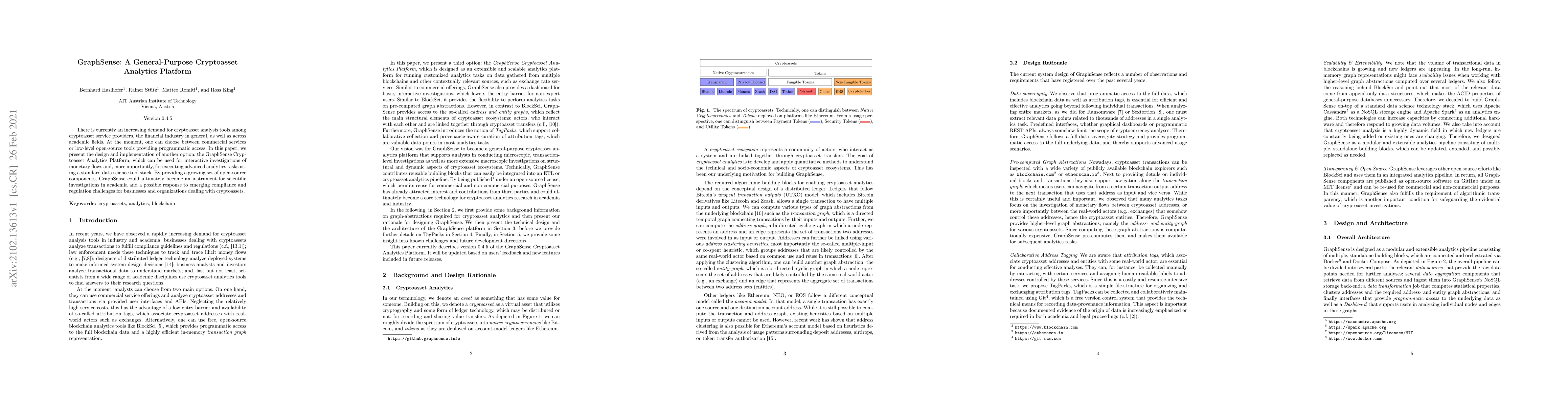 A new cryptoasset analytics platform called GraphSense is presented, providing a general-purpose tool for interactive monetary flow investigations and advanced analytics tasks using a standard data science stack.