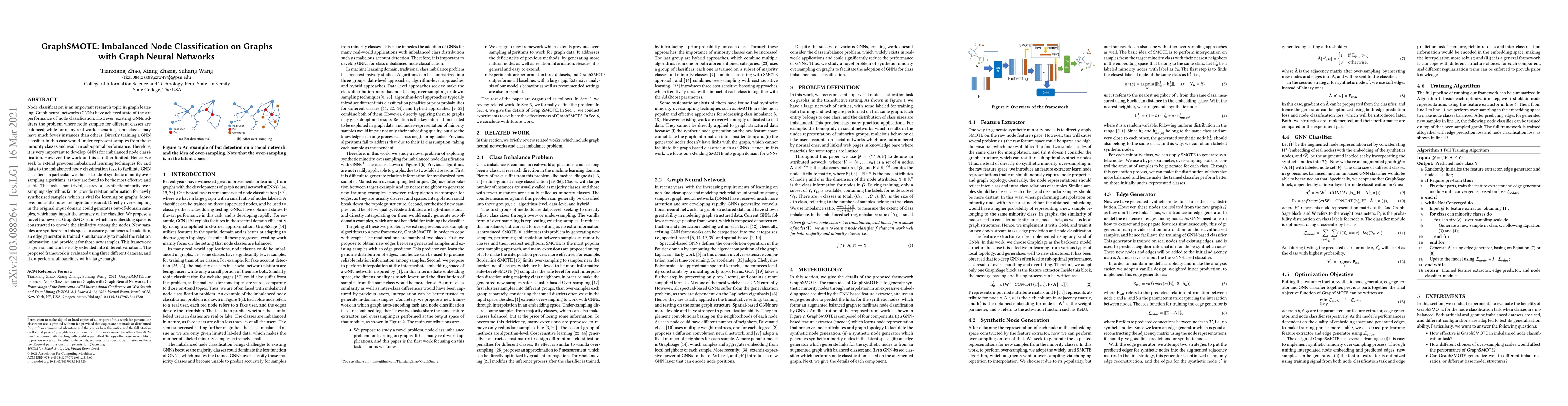 GraphSMOTE addresses the challenge of imbalanced node classification in graph neural networks (GNNs) by introducing a synthetic minority over-sampling technique that synthesizes new samples in an embedding space to maintain relational integrity and avoid out-of-domain issues. The method outperforms existing baselines across multiple datasets.