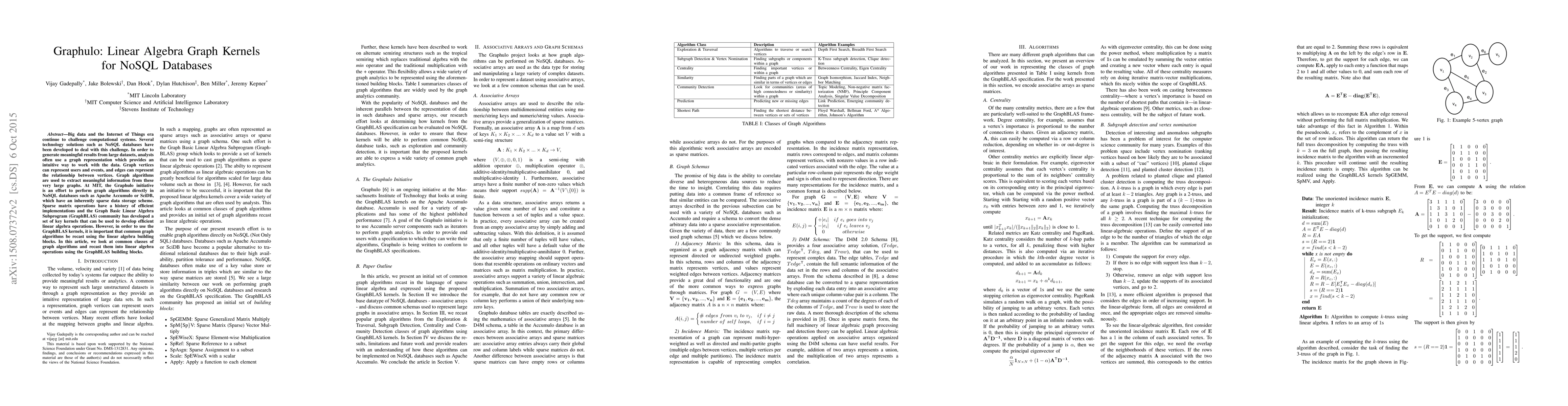 This paper explores the Graphulo initiative at MIT to perform graph algorithms directly within NoSQL databases using linear algebra graph kernels. It focuses on recasting common graph algorithms into efficient linear algebra operations using GraphBLAS kernels to leverage the sparse data storage schemes of NoSQL databases.