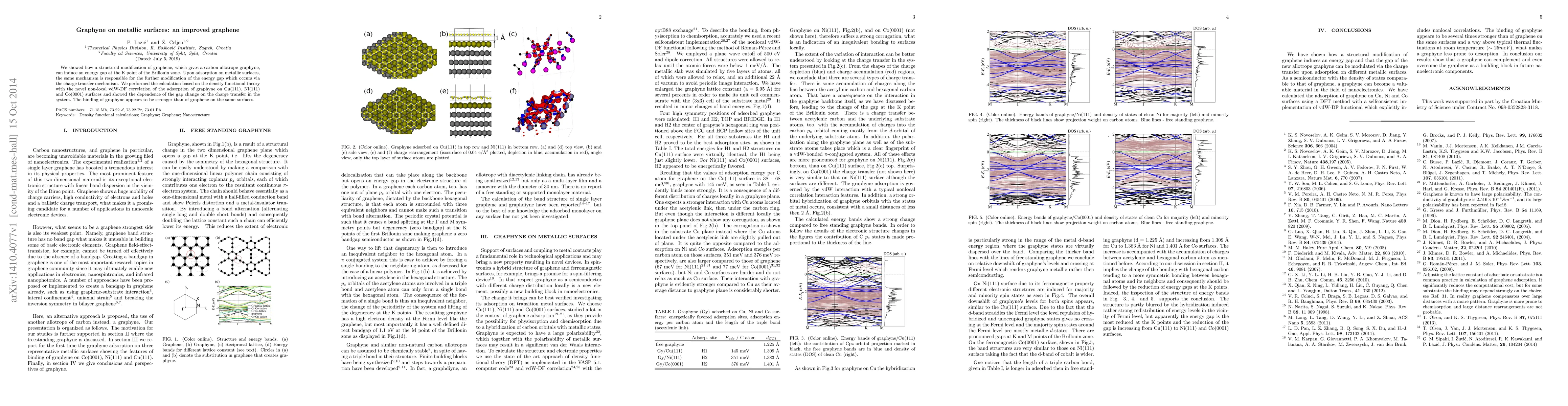 We showed how a structural modification of graphene, which gives a carbon allotrope graphyne, can induce an energy gap at the K point of the Brillouin zone. Upon adsorption on metallic surfaces, the same mechanism is responsible for the further modification of the energy gap which occurs via the charge transfer mechanism. We performed the calculation based on the density functional theory with the novel non-local vdW-DF correlation of the adsorption of graphyne on Cu(111), Ni(111) and Co(0001) surfaces and showed the dependence of the gap change on the charge transfer in the system. The binding of graphyne appears to be stronger than of graphene on the same surfaces.