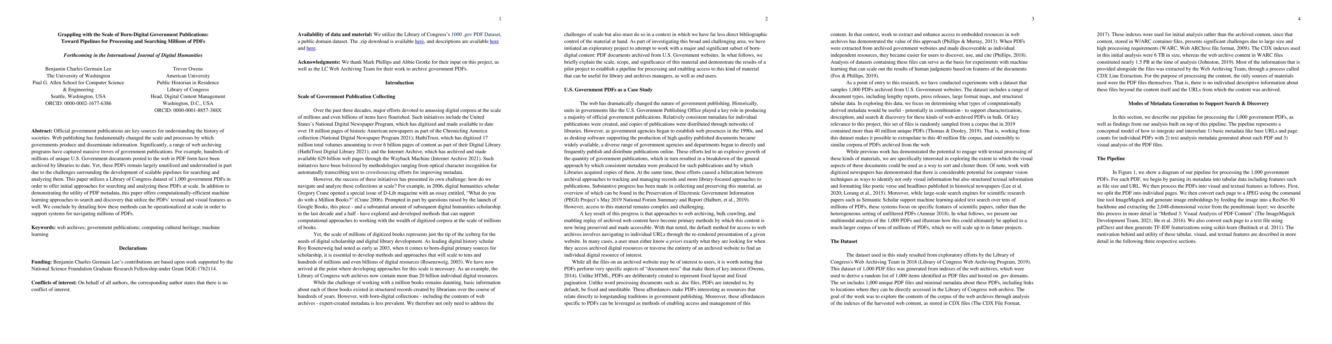 Researchers developed scalable methods to search and analyze millions of government PDFs using machine learning approaches, focusing on textual and visual features. Their work aims to support systems for navigating vast archives of digital government publications.