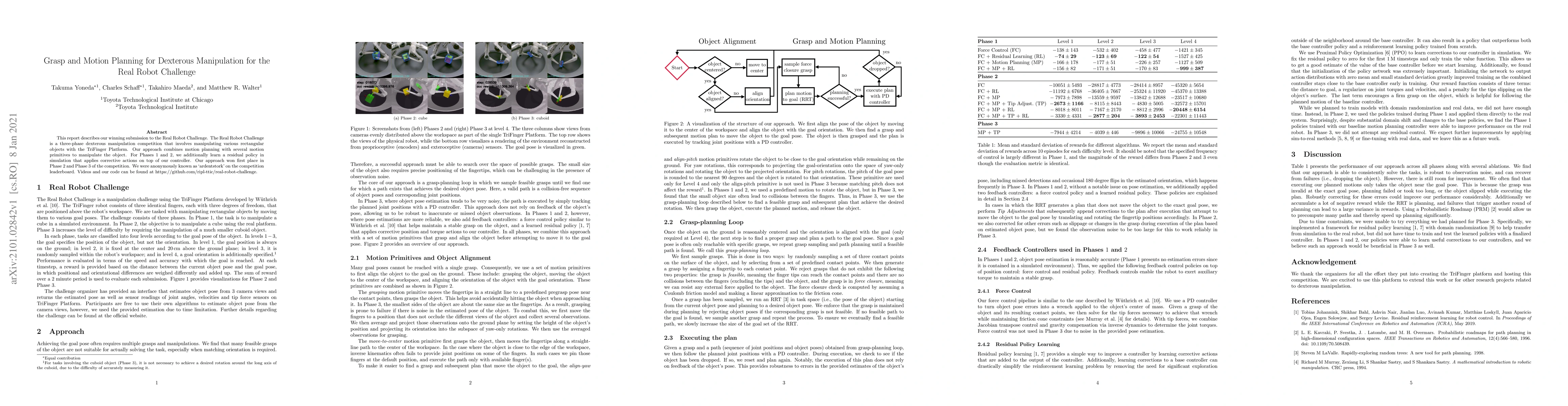 This paper presents a winning strategy for the Real Robot Challenge's dexterous manipulation competition, combining motion planning with learned motion primitives and a residual policy for corrective actions, achieving first place in Phases 2 and 3. The approach utilizes the TriFinger Platform to manipulate various rectangular objects.