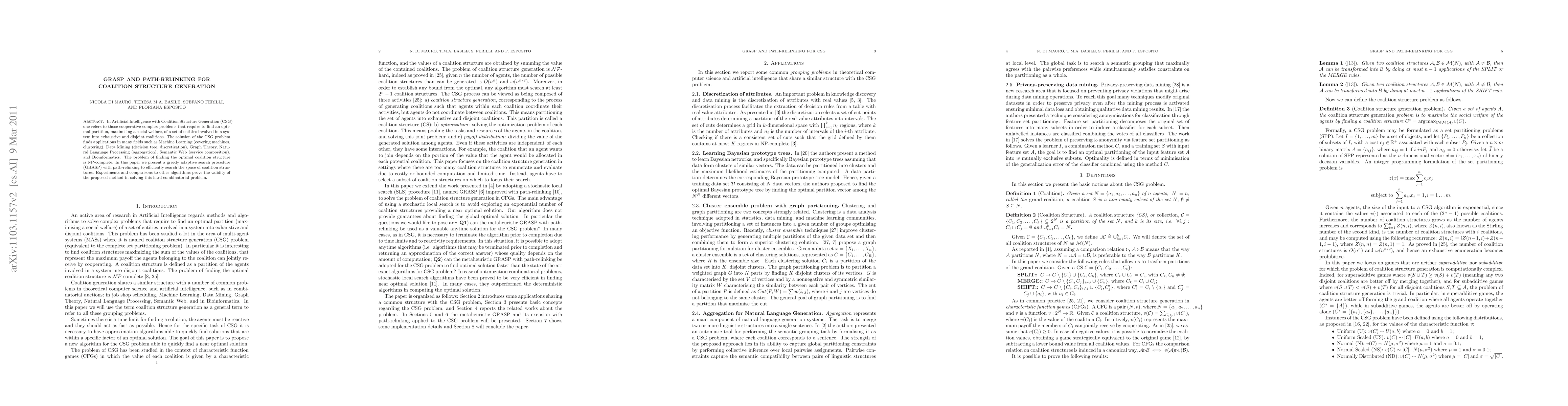 This paper proposes a Greedy Adaptive Search Procedure (GRASP) combined with path-relinking for solving the NP-complete Coalition Structure Generation (CSG) problem, which aims to partition entities into optimal coalitions. The method is shown to be effective through experiments comparing it to other algorithms.
