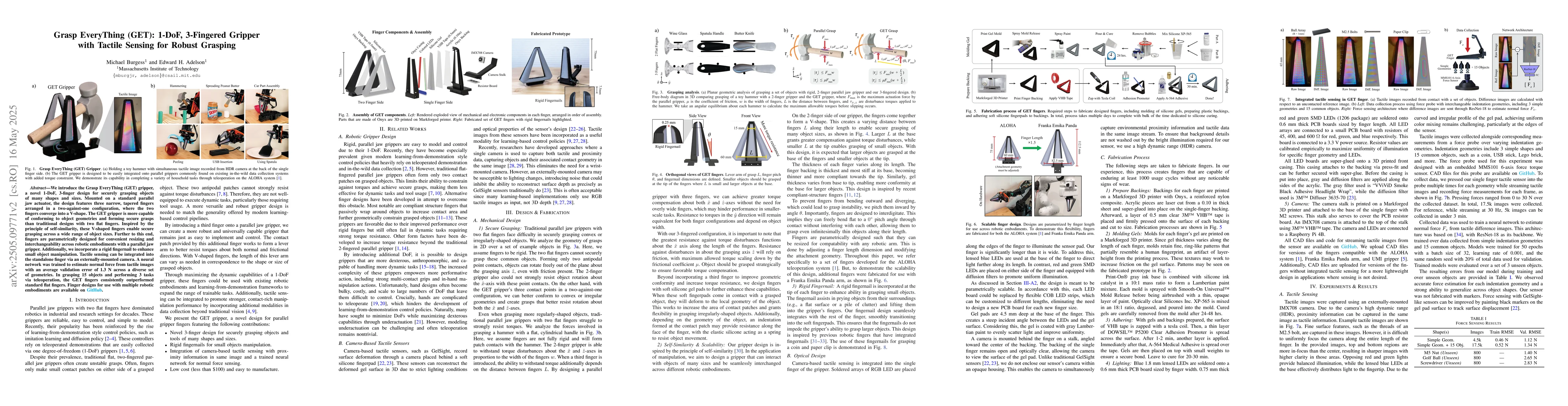 The research introduces the Grasp EveryThing (GET) gripper, a 1-DoF, 3-finger design mounted on a standard parallel jaw actuator. The fingers are narrow, tapered, and arranged in a two-against-one V-shape configuration, inspired by self-similarity principles for adaptable grasping.