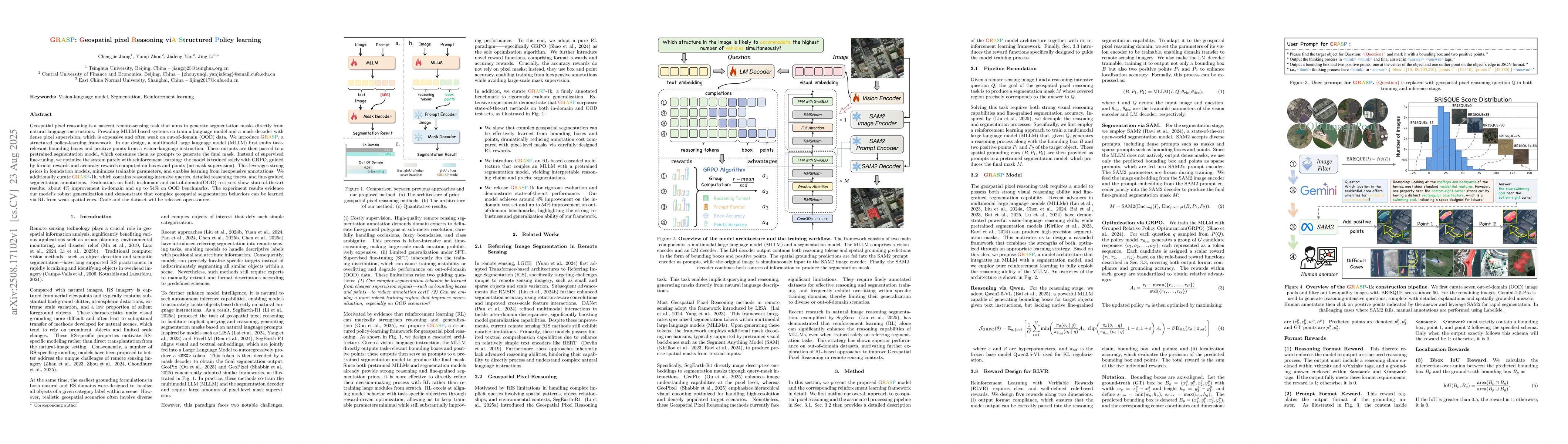Geospatial pixel reasoning is a nascent remote-sensing task that aims to generate segmentation masks directly from natural-language instructions. Prevailing MLLM-based systems co-train a language model and a mask decoder with dense pixel supervision, which is expensive and often weak on out-of-domain (OOD) data. We introduce GRASP, a structured policy-learning framework. In our design, a multimodal large language model first emits task-relevant bounding boxes and positive points from a vision-language instruction. These outputs are then passed to a pre-trained segmentation model, which consumes them as prompts to generate the final mask. Instead of supervised fine-tuning, we optimize the system purely with reinforcement learning: the model is trained solely with GRPO, guided by format rewards and accuracy rewards computed on boxes and points (no mask supervision). This leverages strong priors in foundation models, minimizes trainable parameters, and enables learning from inexpensive annotations. We additionally curate GRASP-1k, which contains reasoning-intensive queries, detailed reasoning traces, and fine-grained segmentation annotations. Evaluations on both in-domain and out-of-domain test sets show state-of-the-art results: about 4% improvement in-domain and up to 54% on OOD benchmarks. The experiment results evidence our model's robust generalization and demonstrate that complex geospatial segmentation behaviors can be learned via RL from weak spatial cues. Code and the dataset will be released open-source.