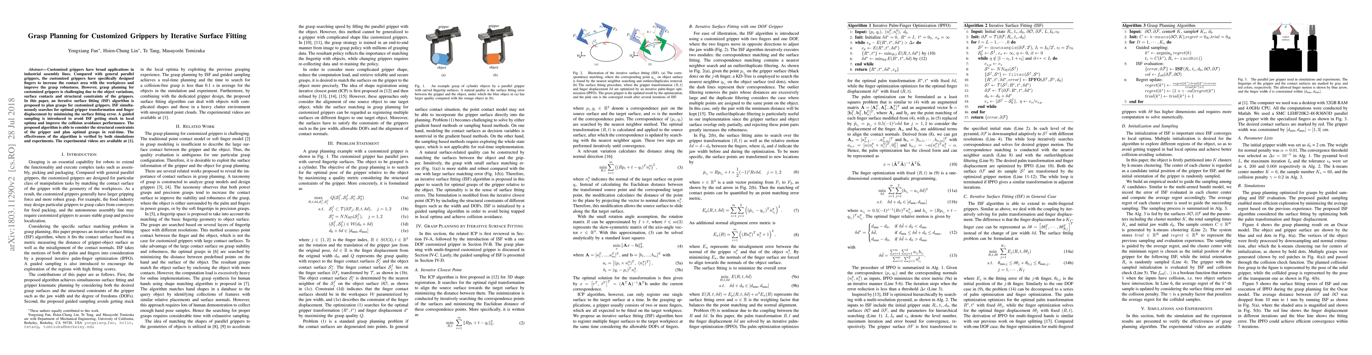 This paper proposes an iterative surface fitting (ISF) algorithm for planning grasps for customized grippers, optimizing gripper transformation and finger displacement to enhance grasp robustness. The method incorporates guided sampling to avoid local optima and improve collision avoidance, demonstrating real-time grasp planning capability validated through simulations and experiments.