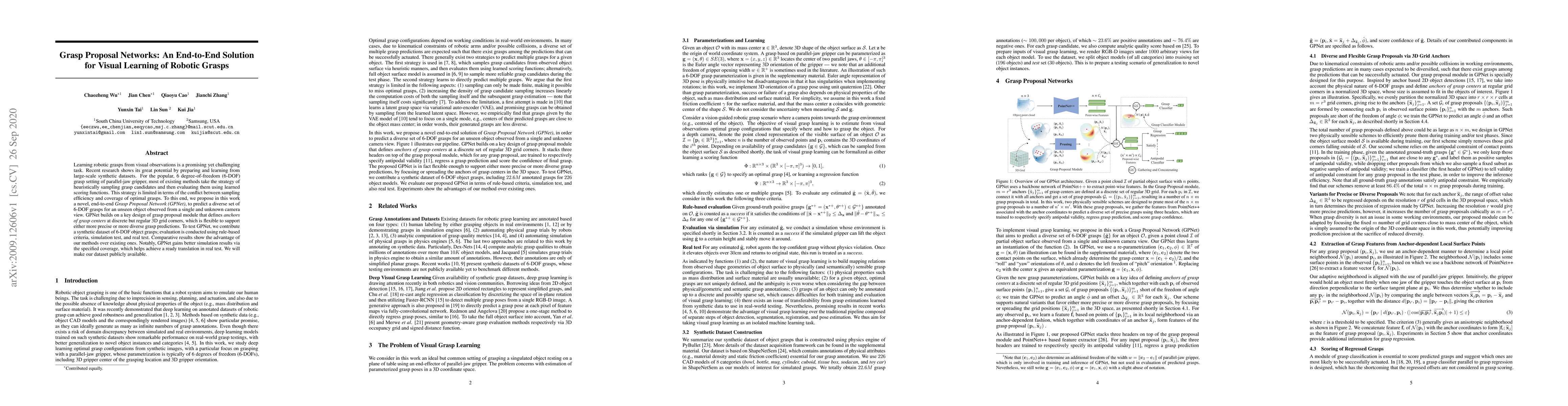 This paper proposes a novel Grasp Proposal Network (GPNet) for end-to-end learning of 6-DOF robotic grasps from visual observations. GPNet predicts diverse grasp candidates using a grasp proposal module with anchor points on a 3D grid, enabling flexible and efficient grasp prediction.