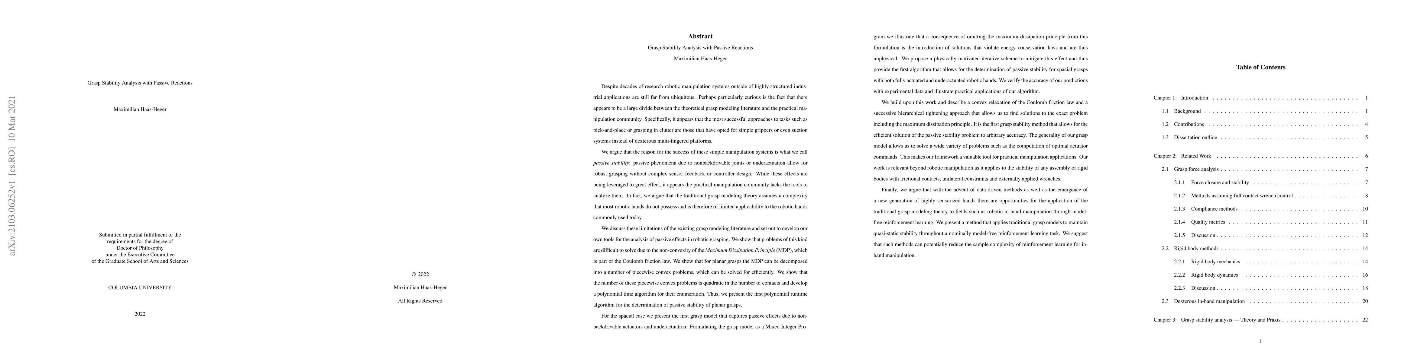[...] We argue that the traditional grasp modeling theory assumes a complexity that most robotic hands do not possess and is therefore of limited applicability to the robotic hands commonly used today. We discuss these limitations of the existing grasp modeling literature and set out to develop our own tools for the analysis of passive effects in robotic grasping. We show that problems of this kind are difficult to solve due to the non-convexity of the Maximum Dissipation Principle (MDP), which is part of the Coulomb friction law. We show that for planar grasps the MDP can be decomposed into a number of piecewise convex problems, which can be solved for efficiently. [...] Thus, we present the first polynomial runtime algorithm for the determination of passive stability of planar grasps. For the spacial case we [...] describe a convex relaxation of the Coulomb friction law and a successive hierarchical tightening approach that allows us to find solutions to the exact problem including the maximum dissipation principle. [...] The generality of our grasp model allows us to solve a wide variety of problems such as the computation of optimal actuator commands. This makes our framework a valuable tool for practical manipulation applications. Our work is relevant beyond robotic manipulation as it applies to the stability of any assembly of rigid bodies with frictional contacts, unilateral constraints and externally applied wrenches. Finally, we argue that with the advent of data-driven methods as well as the emergence of a new generation of highly sensorized hands there are opportunities for the application of the traditional grasp modeling theory to fields such as robotic in-hand manipulation through model-free reinforcement learning. We present a method that applies traditional grasp models to maintain quasi-static stability throughout a nominally model-free reinforcement learning task. [...]