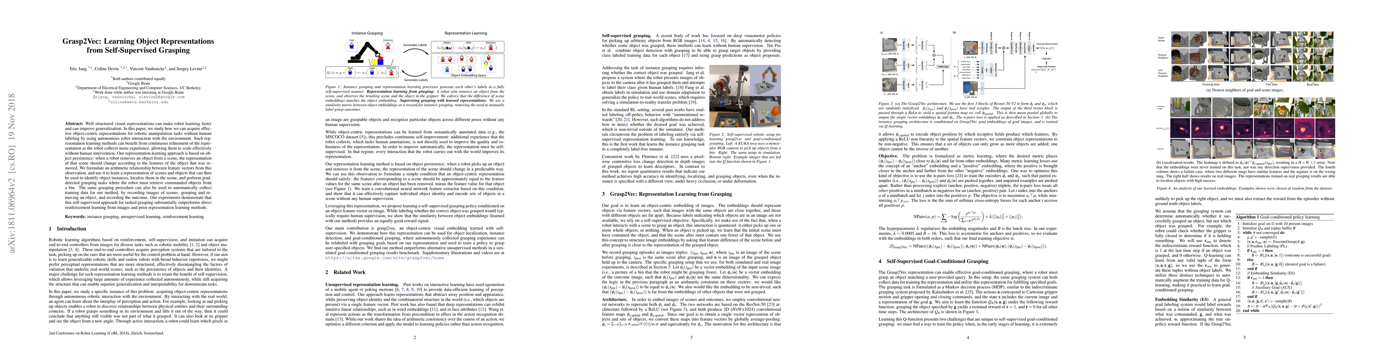 This paper proposes a self-supervised method, Grasp2Vec, to learn object-centric representations for robotic manipulation tasks without human labeling, leveraging continuous refinement through robot interaction. The approach uses object persistence to formulate an arithmetic relationship between feature vectors, enabling effective scene and object representation learning for instance identification, localization, and goal-directed grasping.