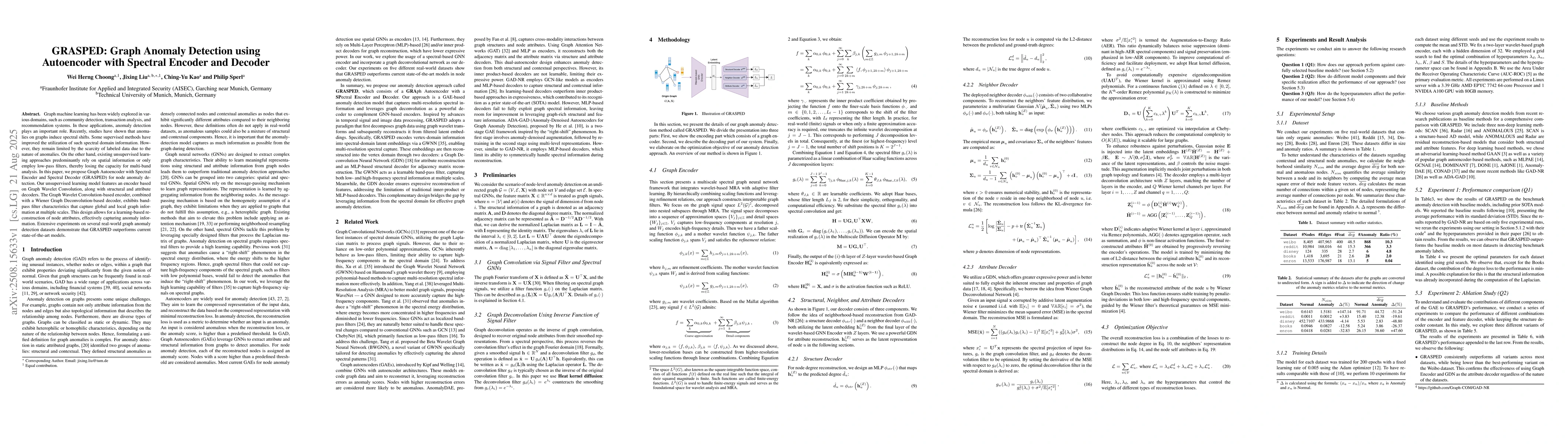 Graph machine learning has been widely explored in various domains, such as community detection, transaction analysis, and recommendation systems. In these applications, anomaly detection plays an important role. Recently, studies have shown that anomalies on graphs induce spectral shifts. Some supervised methods have improved the utilization of such spectral domain information. However, they remain limited by the scarcity of labeled data due to the nature of anomalies. On the other hand, existing unsupervised learning approaches predominantly rely on spatial information or only employ low-pass filters, thereby losing the capacity for multi-band analysis. In this paper, we propose Graph Autoencoder with Spectral Encoder and Spectral Decoder (GRASPED) for node anomaly detection. Our unsupervised learning model features an encoder based on Graph Wavelet Convolution, along with structural and attribute decoders. The Graph Wavelet Convolution-based encoder, combined with a Wiener Graph Deconvolution-based decoder, exhibits bandpass filter characteristics that capture global and local graph information at multiple scales. This design allows for a learning-based reconstruction of node attributes, effectively capturing anomaly information. Extensive experiments on several real-world graph anomaly detection datasets demonstrate that GRASPED outperforms current state-of-the-art models.