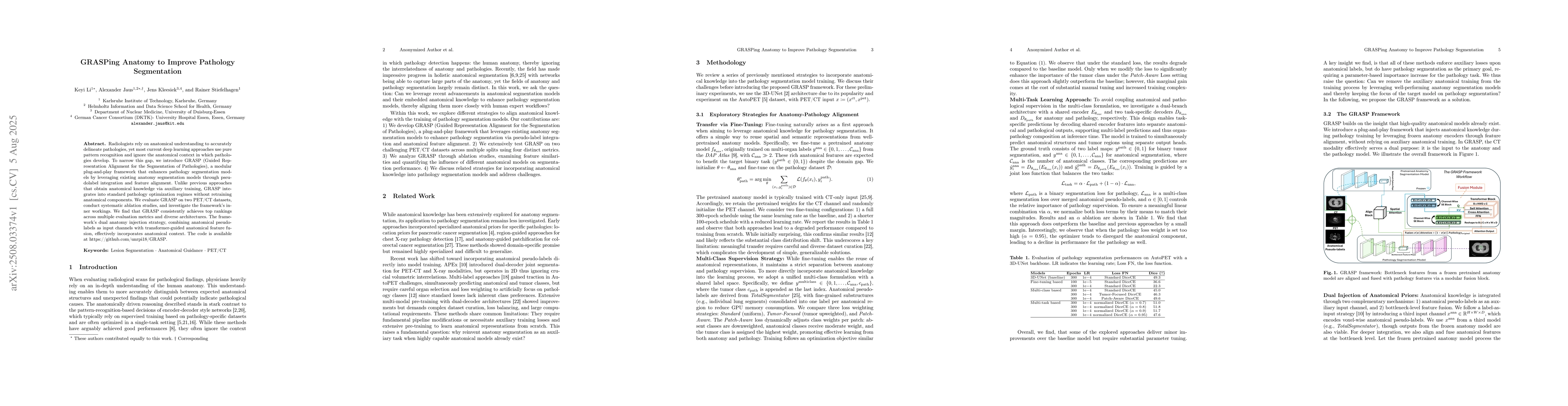 Radiologists rely on anatomical understanding to accurately delineate pathologies, yet most current deep learning approaches use pure pattern recognition and ignore the anatomical context in which pathologies develop. To narrow this gap, we introduce GRASP (Guided Representation Alignment for the Segmentation of Pathologies), a modular plug-and-play framework that enhances pathology segmentation models by leveraging existing anatomy segmentation models through pseudolabel integration and feature alignment. Unlike previous approaches that obtain anatomical knowledge via auxiliary training, GRASP integrates into standard pathology optimization regimes without retraining anatomical components. We evaluate GRASP on two PET/CT datasets, conduct systematic ablation studies, and investigate the framework's inner workings. We find that GRASP consistently achieves top rankings across multiple evaluation metrics and diverse architectures. The framework's dual anatomy injection strategy, combining anatomical pseudo-labels as input channels with transformer-guided anatomical feature fusion, effectively incorporates anatomical context.