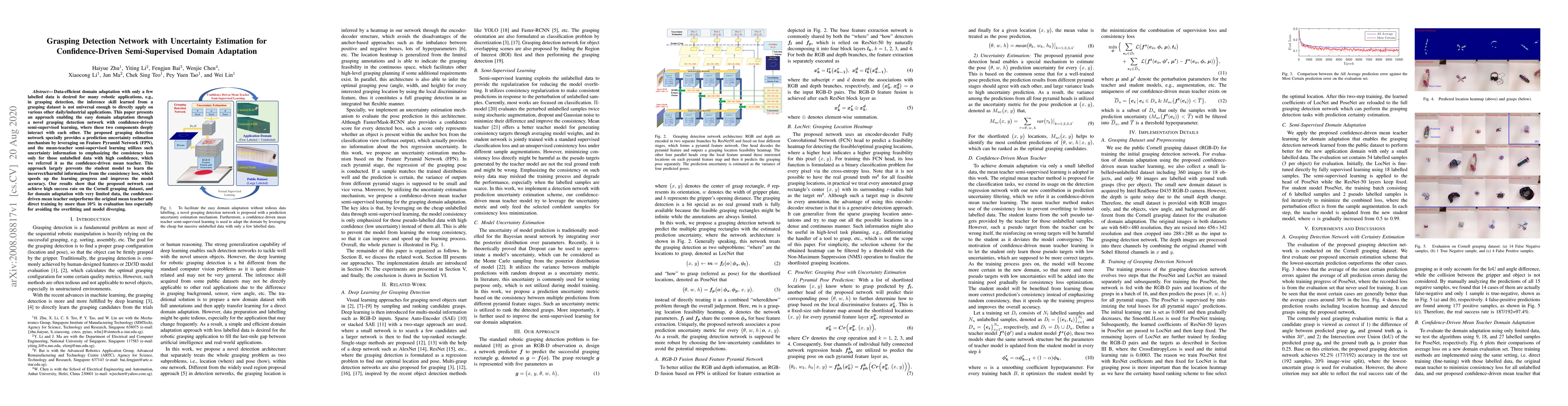 Data-efficient domain adaptation with only a few labelled data is desired for many robotic applications, e.g., in grasping detection, the inference skill learned from a grasping dataset is not universal enough to directly apply on various other daily/industrial applications. This paper presents an approach enabling the easy domain adaptation through a novel grasping detection network with confidence-driven semi-supervised learning, where these two components deeply interact with each other. The proposed grasping detection network specially provides a prediction uncertainty estimation mechanism by leveraging on Feature Pyramid Network (FPN), and the mean-teacher semi-supervised learning utilizes such uncertainty information to emphasizing the consistency loss only for those unlabelled data with high confidence, which we referred it as the confidence-driven mean teacher. This approach largely prevents the student model to learn the incorrect/harmful information from the consistency loss, which speeds up the learning progress and improves the model accuracy. Our results show that the proposed network can achieve high success rate on the Cornell grasping dataset, and for domain adaptation with very limited data, the confidence-driven mean teacher outperforms the original mean teacher and direct training by more than 10% in evaluation loss especially for avoiding the overfitting and model diverging.