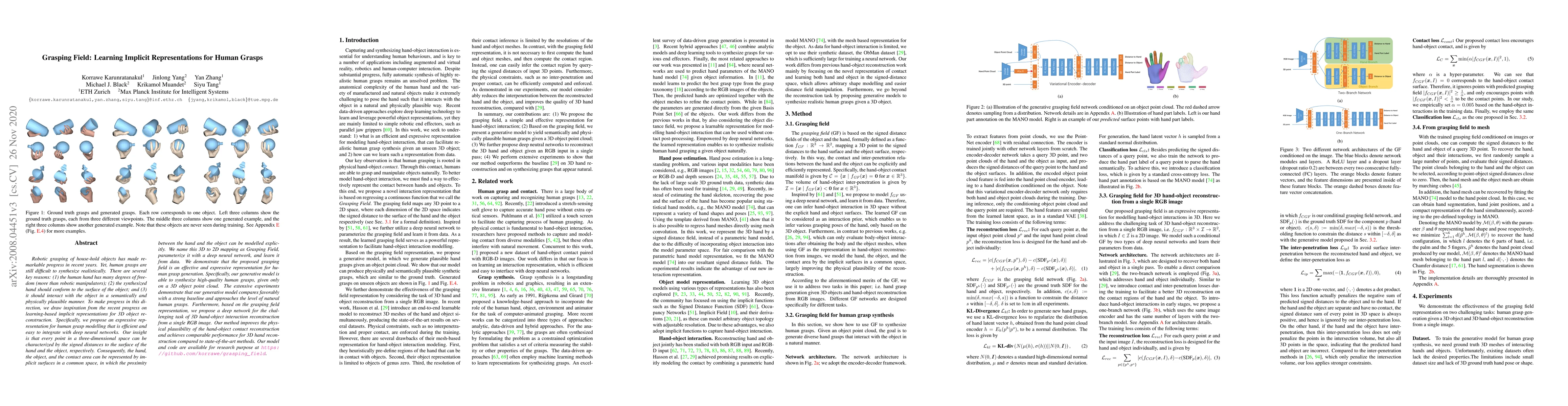 This paper proposes a novel implicit representation called Grasping Field for modeling human grasps, leveraging deep neural networks to learn signed distances from the hand and object surfaces. The model synthesizes realistic human grasps from 3D object point clouds, demonstrating improved physical plausibility and comparable performance to state-of-the-art methods.