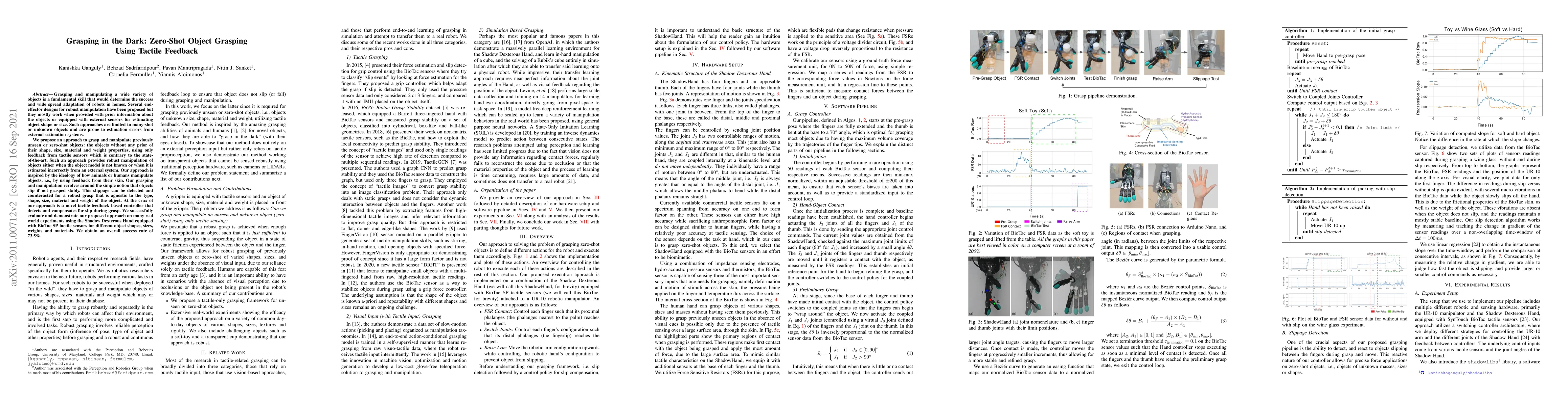 Grasping and manipulating a wide variety of objects is a fundamental skill that would determine the success and wide spread adaptation of robots in homes. Several end-effector designs for robust manipulation have been proposed but they mostly work when provided with prior information about the objects or equipped with external sensors for estimating object shape or size. Such approaches are limited to many-shot or unknown objects and are prone to estimation errors from external estimation systems. We propose an approach to grasp and manipulate previously unseen or zero-shot objects: the objects without any prior of their shape, size, material and weight properties, using only feedback from tactile sensors which is contrary to the state-of-the-art. Such an approach provides robust manipulation of objects either when the object model is not known or when it is estimated incorrectly from an external system. Our approach is inspired by the ideology of how animals or humans manipulate objects, i.e., by using feedback from their skin. Our grasping and manipulation revolves around the simple notion that objects slip if not grasped stably. This slippage can be detected and counteracted for a robust grasp that is agnostic to the type, shape, size, material and weight of the object. At the crux of our approach is a novel tactile feedback based controller that detects and compensates for slip during grasp. We successfully evaluate and demonstrate our proposed approach on many real world experiments using the Shadow Dexterous Hand equipped with BioTac SP tactile sensors for different object shapes, sizes, weights and materials. We obtain an overall success rate of 73.5%