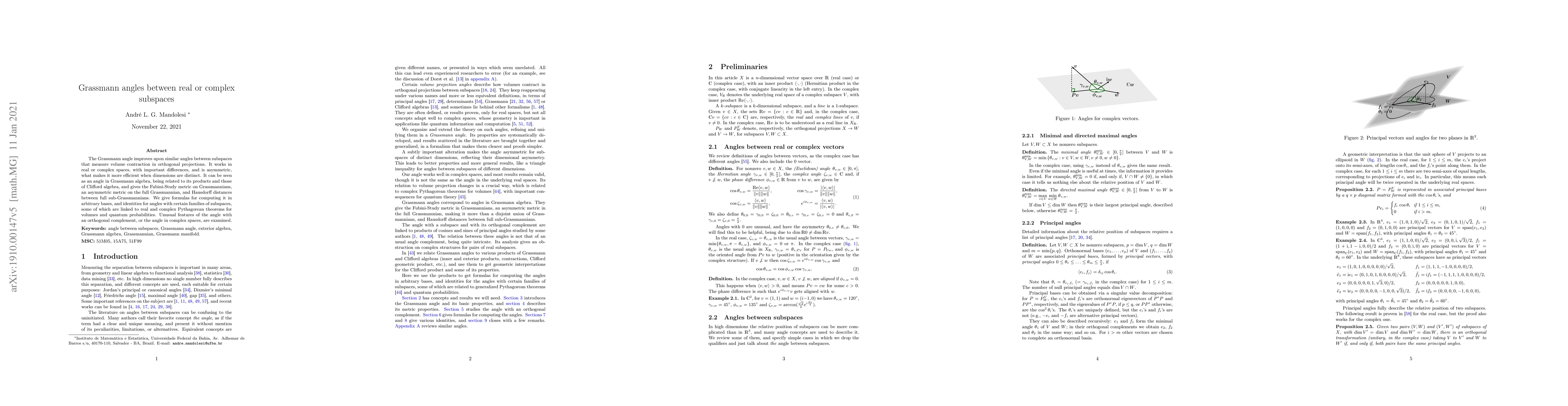 This paper introduces the Grassmann angle, an asymmetric measure of distance between real or complex subspaces, offering a more efficient metric than traditional methods. It provides formulas for computation and explores its unique properties, including connections to Clifford algebra and implications for quantum probabilities.