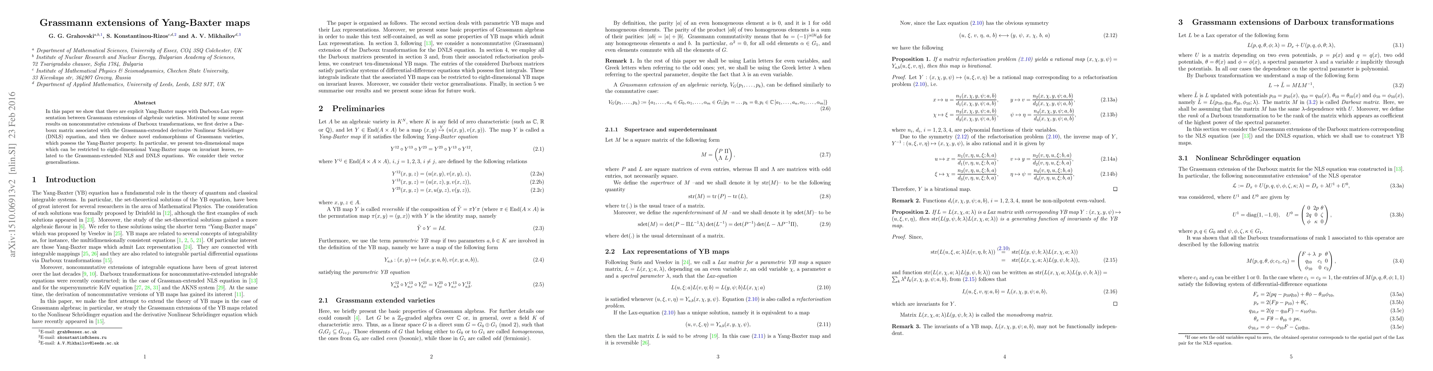 This paper introduces explicit Yang-Baxter maps derived from Darboux-Lax representations between Grassmann extensions of algebraic varieties. It develops novel endomorphisms of Grassmann varieties with Yang-Baxter properties, particularly ten-dimensional maps linked to the Grassmann-extended Nonlinear Schrödinger equations.