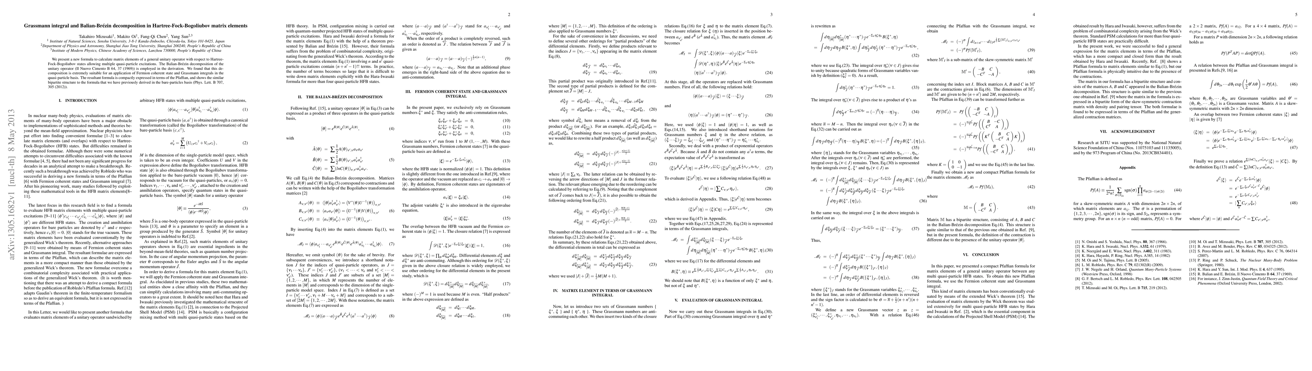 This paper introduces a new formula for calculating matrix elements of a general unitary operator concerning Hartree-Fock-Bogoliubov states, utilizing the Balian-Brézin decomposition and Grassmann integrals. The formula is compactly expressed in terms of the Pfaffian and maintains a similar bipartite structure to a previously derived formula in the bare-particles basis.