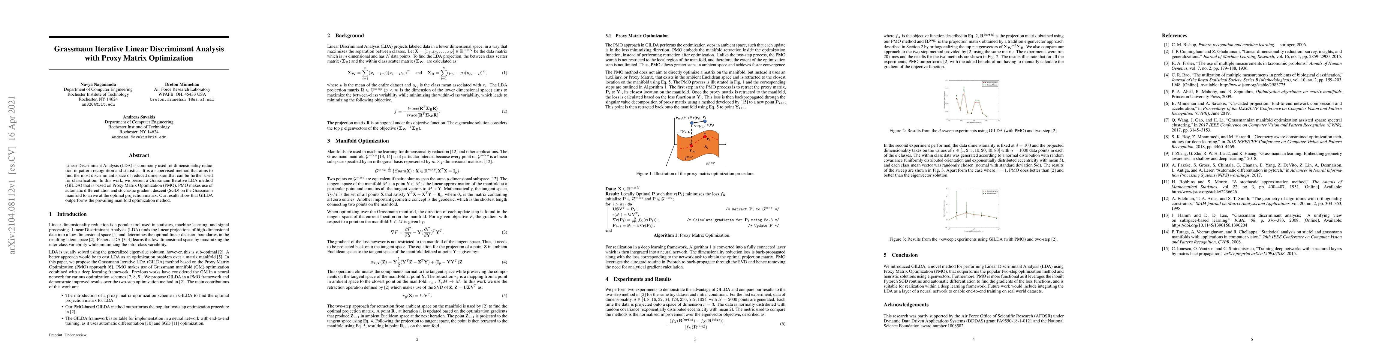 This paper introduces Grassmann Iterative Linear Discriminant Analysis (GILDA) with Proxy Matrix Optimization (PMO), utilizing automatic differentiation and stochastic gradient descent on the Grassmann manifold for optimal projection. GILDA outperforms existing manifold optimization methods for dimensionality reduction in pattern recognition.
