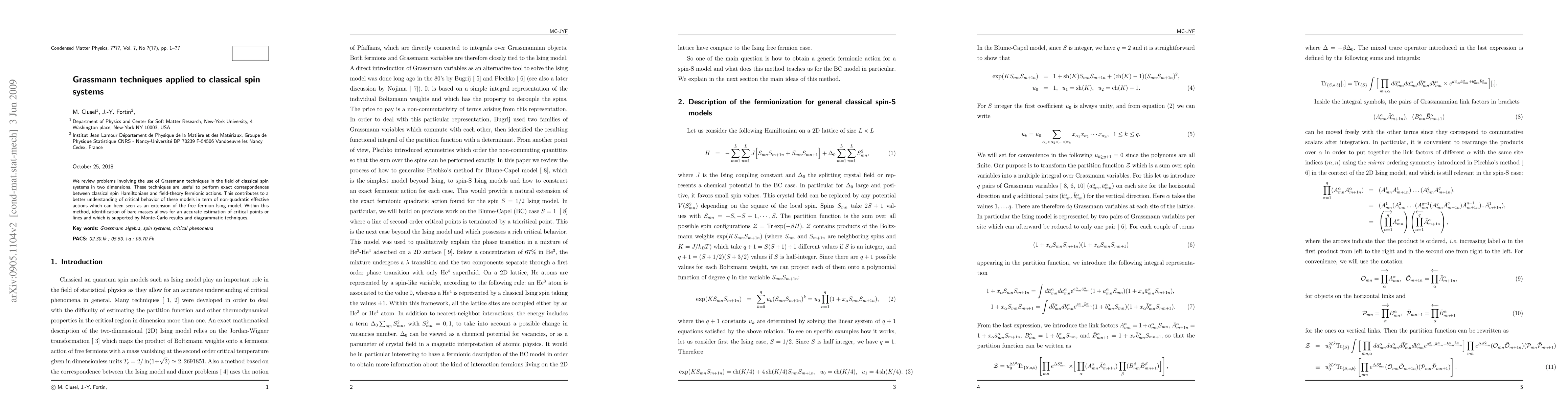 We review problems involving the use of Grassmann techniques in the field of classical spin systems in two dimensions. These techniques are useful to perform exact correspondences between classical spin Hamiltonians and field-theory fermionic actions. This contributes to a better understanding of critical behavior of these models in term of non-quadratic effective actions which can been seen as an extension of the free fermion Ising model. Within this method, identification of bare masses allows for an accurate estimation of critical points or lines and which is supported by Monte-Carlo results and diagrammatic techniques.