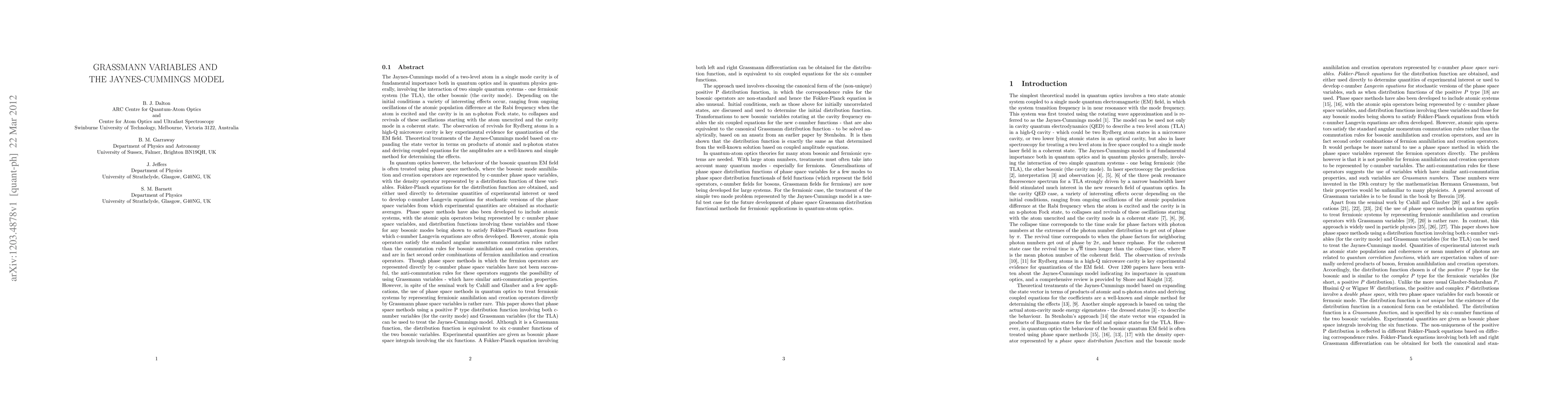 This paper uses phase space methods to treat the Jaynes-Cummings model using a positive P distribution function involving both c-number variables and Grassmann variables, allowing for analytical solution of the Fokker-Planck equation.