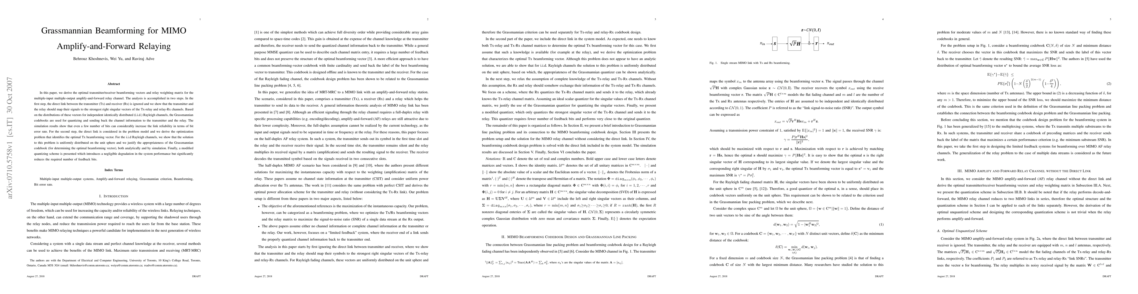 This paper develops optimal beamforming vectors and a relay weighting matrix for MIMO amplify-and-forward relaying, utilizing Grassmannian codebooks for channel information feedback. It shows that ignoring the direct link initially leads to mapping signals to the strongest singular vectors, while considering the direct link results in uniformly distributed optimal beamforming vectors on the unit sphere.