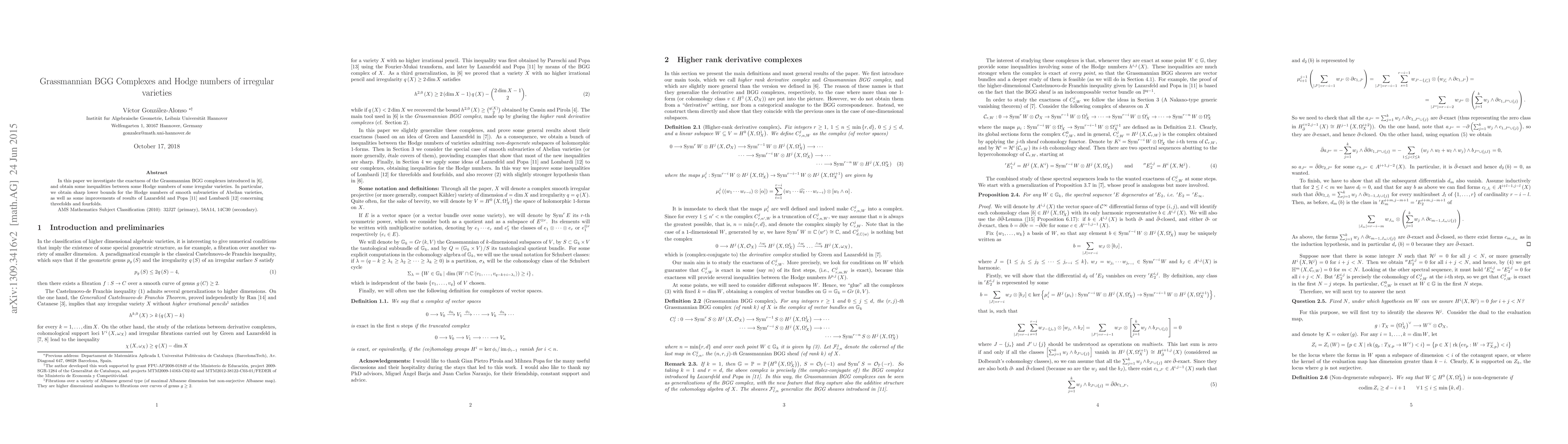This paper studies the exactness of Grassmannian BGG complexes and derives inequalities for Hodge numbers of irregular varieties, achieving sharp lower bounds for smooth subvarieties in Abelian varieties and improving existing results on threefolds and fourfolds.