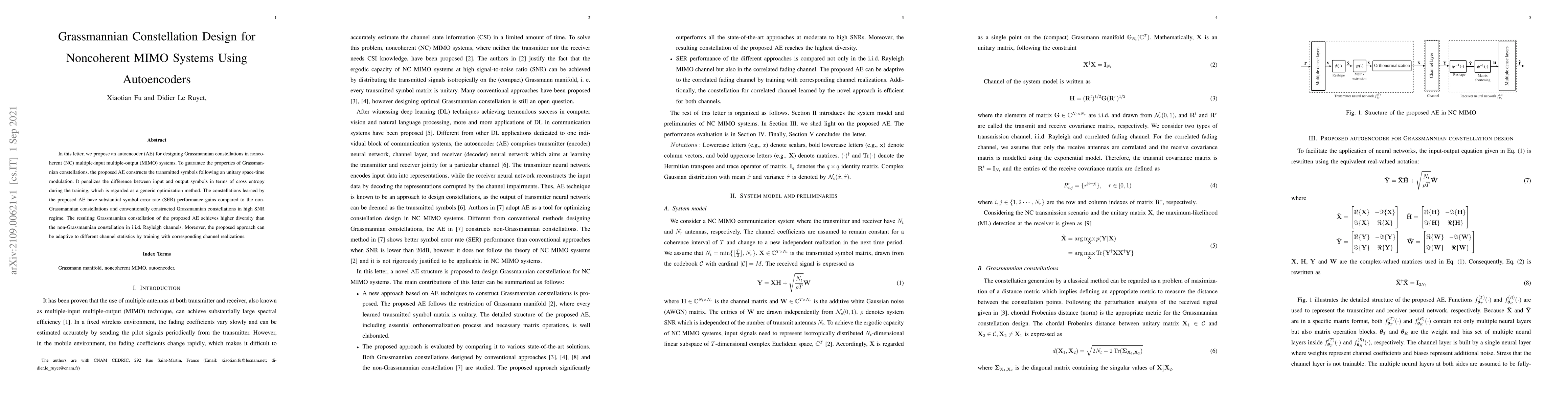 This paper proposes an autoencoder for designing Grassmannian constellations in noncoherent MIMO systems, achieving better symbol error rate performance and higher diversity than conventional methods, adaptable to various channel conditions.