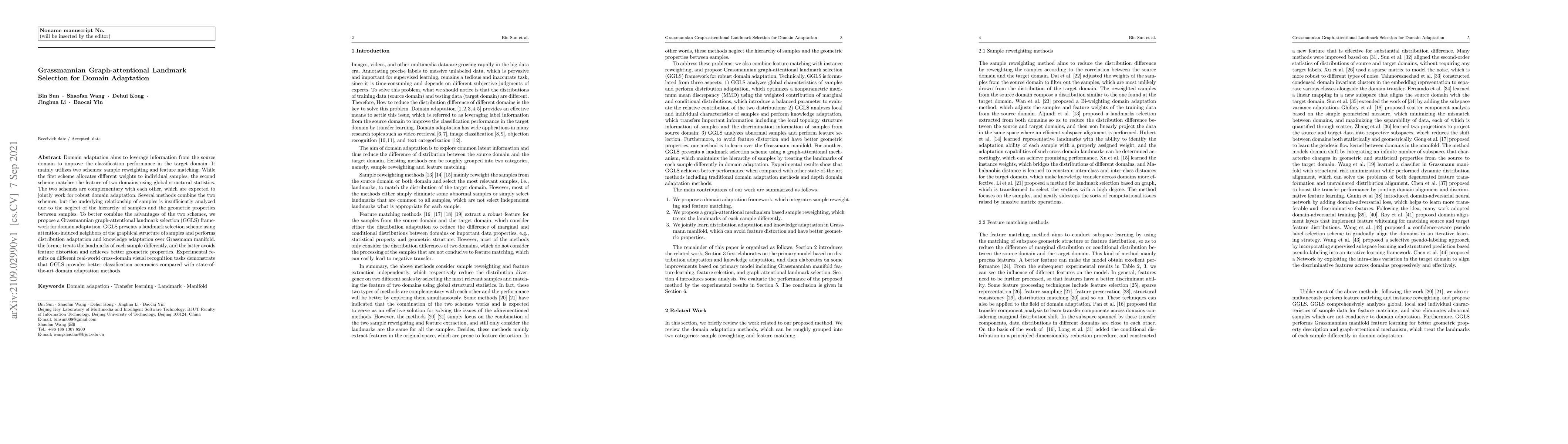 A new method called Grassmannian graph-attentional landmark selection (GGLS) improves domain adaptation in visual recognition tasks by combining attention-induced neighbor selection with distribution adaptation on a Grassmann manifold, achieving better classification accuracies than state-of-the-art methods.