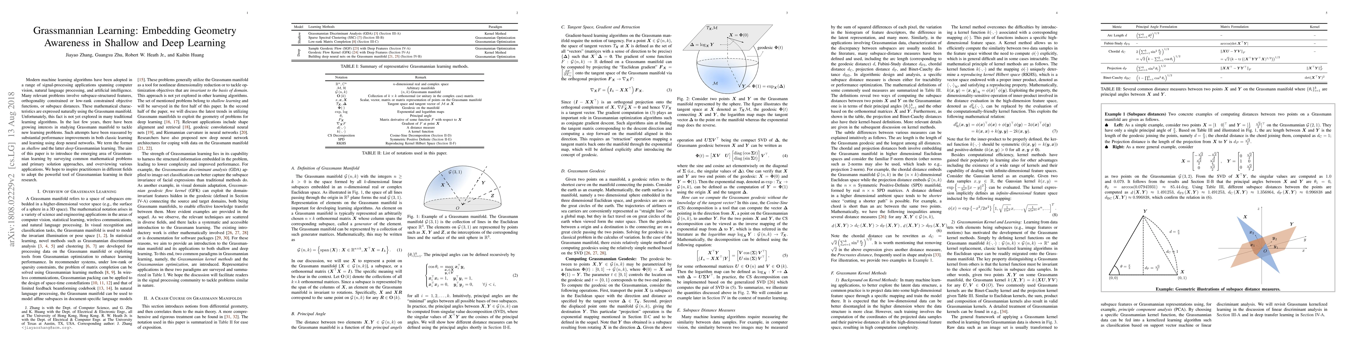 This paper introduces Grassmannian learning, a method applying the Grassmann manifold's mathematical properties to machine learning problems involving subspace-structured features. It surveys shallow and deep learning applications, highlighting performance improvements and aiming to encourage wider adoption of this technique.