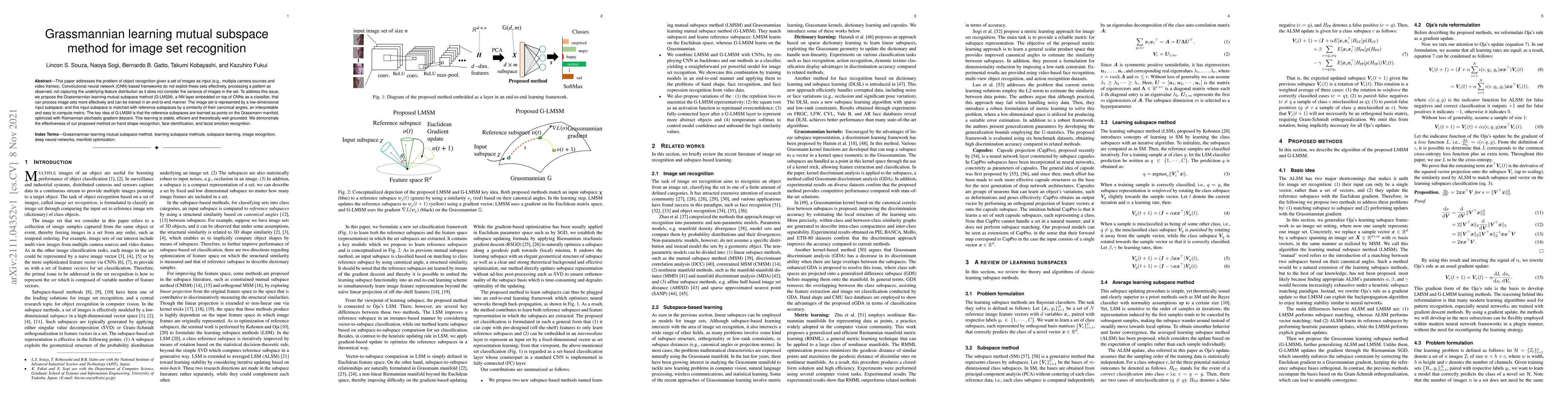 This paper addresses the problem of object recognition given a set of images as input (e.g., multiple camera sources and video frames). Convolutional neural network (CNN)-based frameworks do not exploit these sets effectively, processing a pattern as observed, not capturing the underlying feature distribution as it does not consider the variance of images in the set. To address this issue, we propose the Grassmannian learning mutual subspace method (G-LMSM), a NN layer embedded on top of CNNs as a classifier, that can process image sets more effectively and can be trained in an end-to-end manner. The image set is represented by a low-dimensional input subspace; and this input subspace is matched with reference subspaces by a similarity of their canonical angles, an interpretable and easy to compute metric. The key idea of G-LMSM is that the reference subspaces are learned as points on the Grassmann manifold, optimized with Riemannian stochastic gradient descent. This learning is stable, efficient and theoretically well-grounded. We demonstrate the effectiveness of our proposed method on hand shape recognition, face identification, and facial emotion recognition.