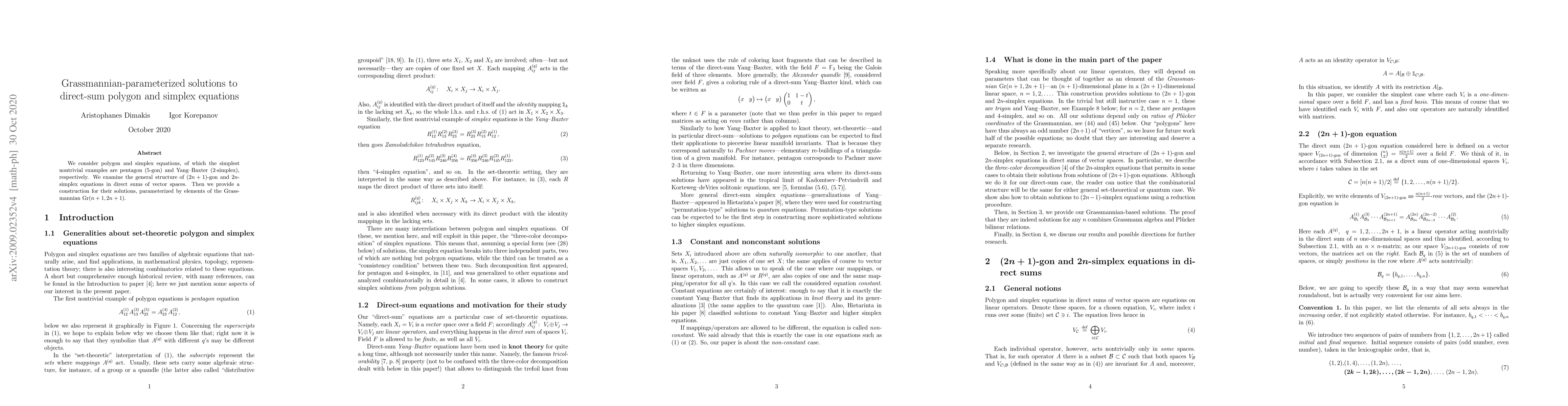 We consider polygon and simplex equations, of which the simplest nontrivial examples are pentagon (5-gon) and Yang--Baxter (2-simplex), respectively. We examine the general structure of (2n+1)-gon and 2n-simplex equations in direct sums of vector spaces. Then we provide a construction for their solutions, parameterized by elements of the Grassmannian Gr(n+1,2n+1).