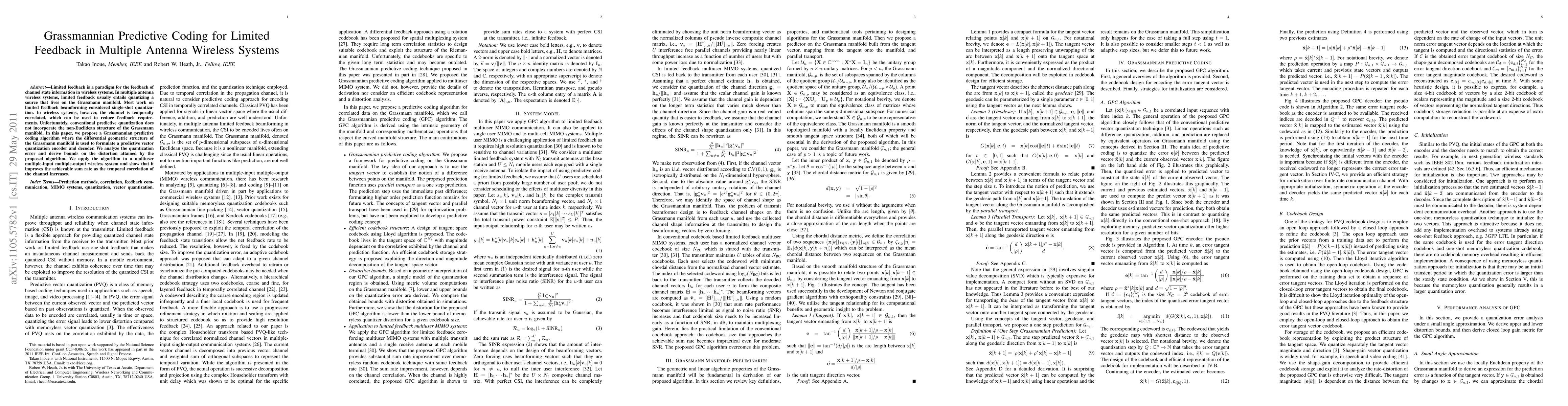 This paper proposes a Grassmannian predictive coding algorithm for limited feedback in multiple antenna wireless systems, leveraging the differential geometric structure of the Grassmann manifold to reduce feedback requirements. The algorithm improves the achievable sum rate by effectively utilizing temporal channel correlation, outperforming conventional predictive quantization methods.