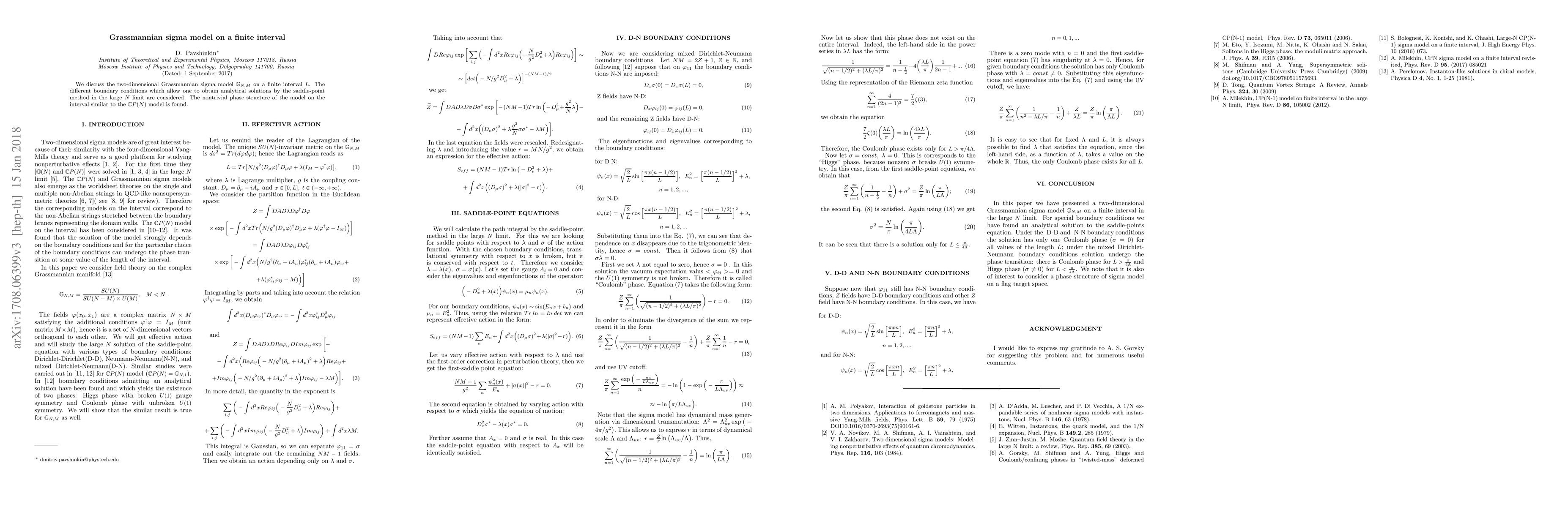 We discuss the two-dimensional Grassmannian sigma model $\mathbb{G}_{N, M}$ on a finite interval $L$. The different boundary conditions which allow to obtain analytical solutions by the saddle-point method in the large $N$ limit are considered. The nontrivial phase structure of the model on the interval similar to $\mathbb{C}P(N)$ model is found.