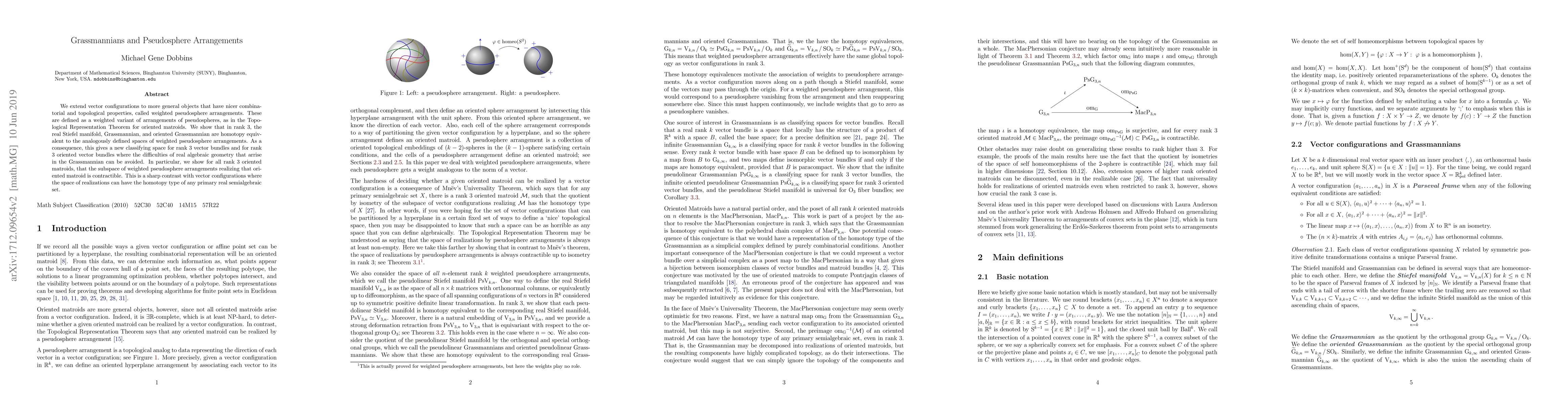 We extend vector configurations to more general objects that have nicer combinatorial and topological properties, called weighted pseudosphere arrangements. These are defined as a weighted variant of arrangements of pseudospheres, as in the Topological Representation Theorem for oriented matroids. We show that in rank 3, the real Stiefel manifold, Grassmannian, and oriented Grassmannian are homotopy equivalent to the analogously defined spaces of weighted pseudosphere arrangements. As a consequence, this gives a new classifying space for rank 3 vector bundles and for rank 3 oriented vector bundles where the difficulties of real algebraic geometry that arrise in the Grassmannian can be avoided. In particular, we show for all rank 3 oriented matroids, that the subspace of weighted pseudosphere arrangements realizing that oriented matroid is contractible. This is a sharp contrast with vector configurations where the space of realizations can have the homotopy type of any primary real semialgebraic set.